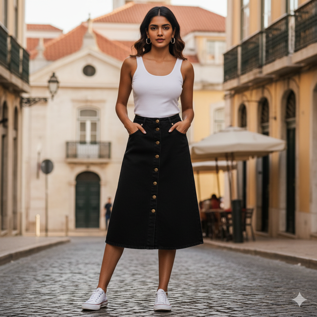 100% cotton denim, A-line, button front, side pockets. Made in India.