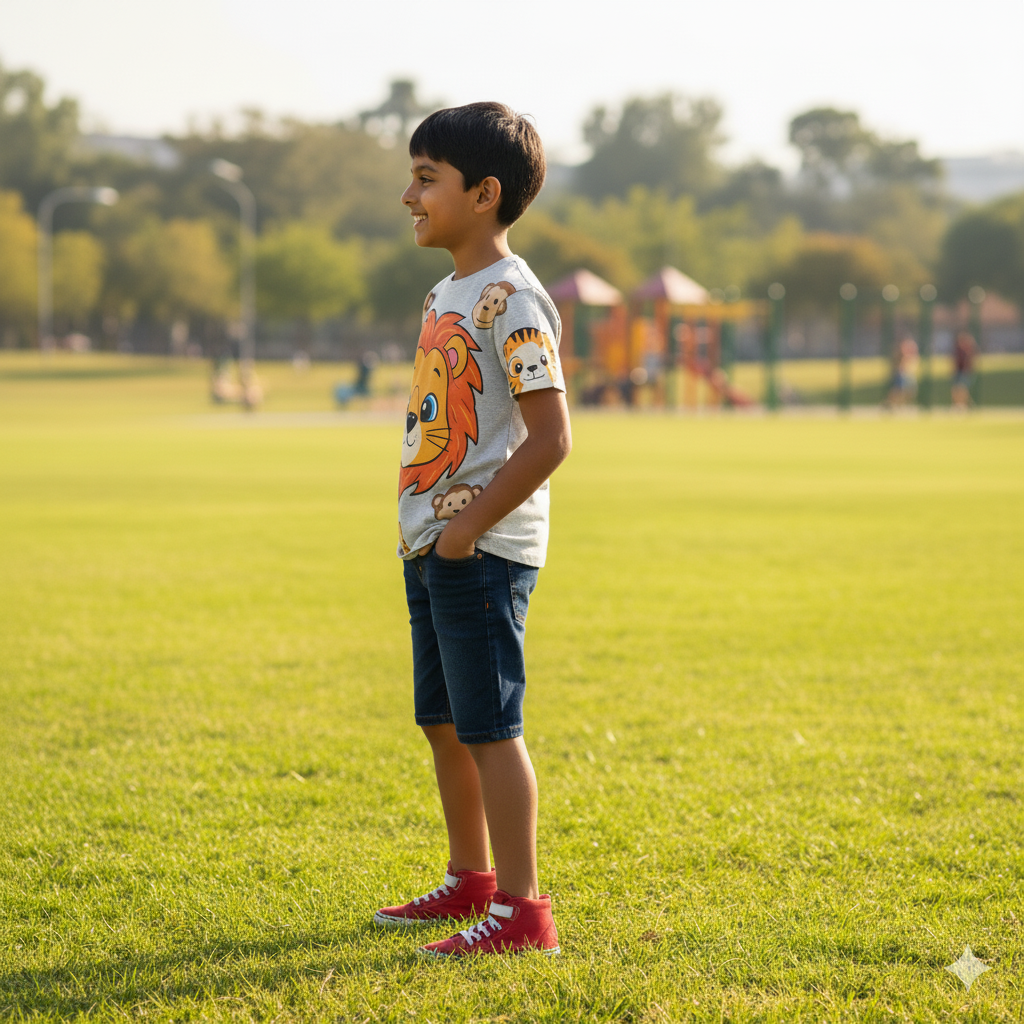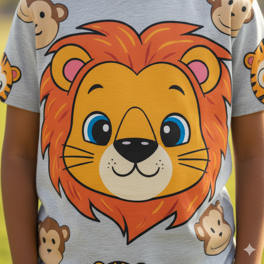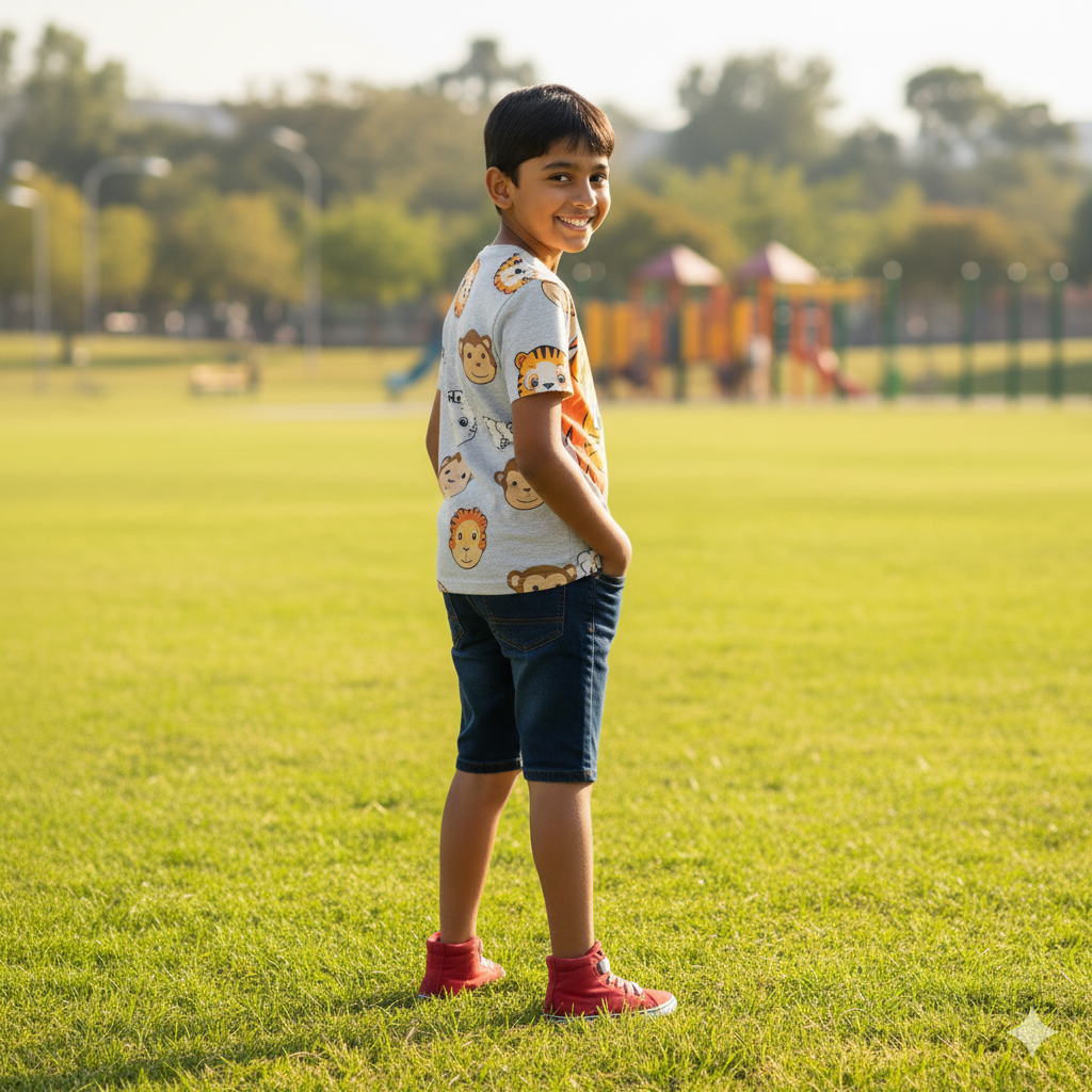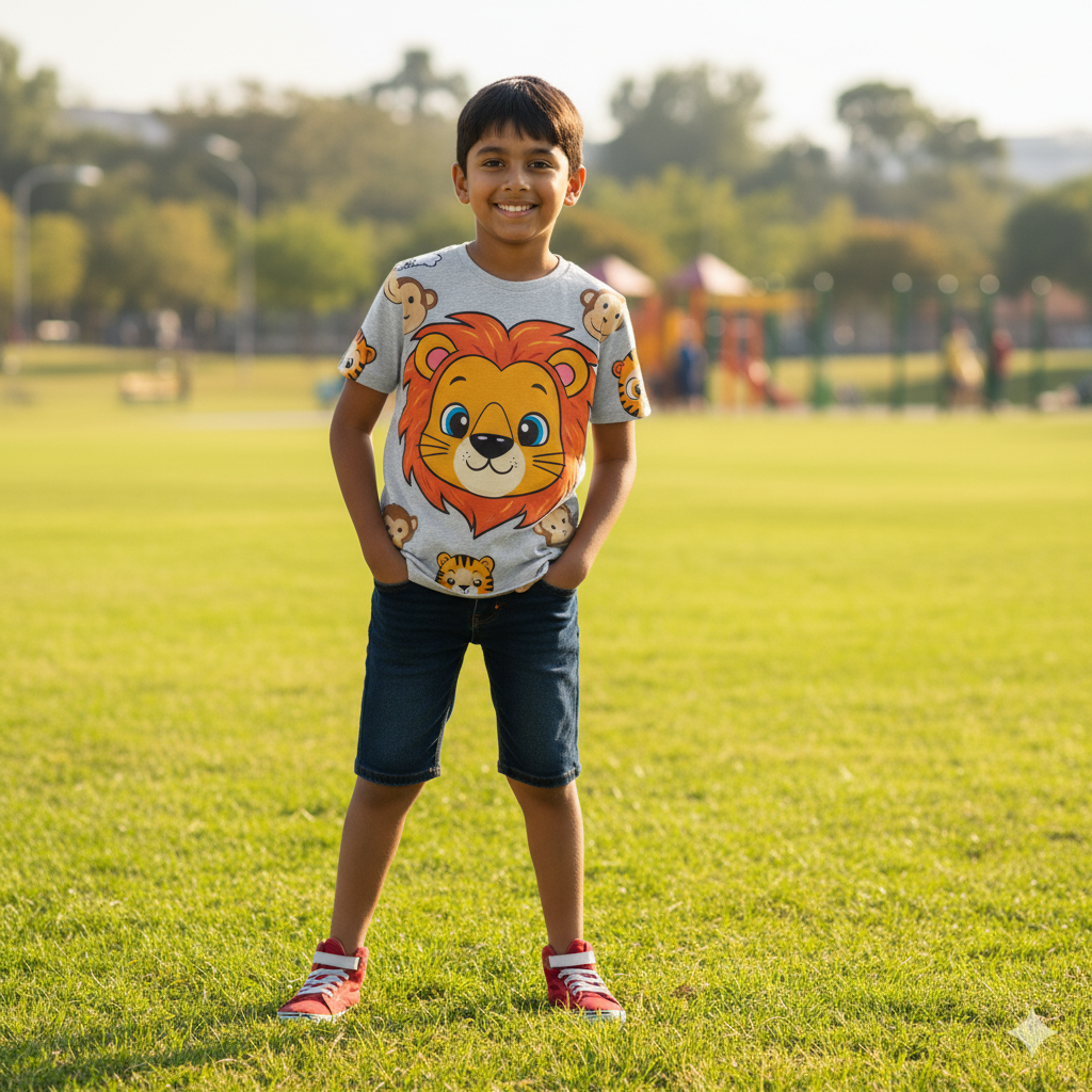 This animal face print T-shirt features playful animal face characters. Made from soft cotton jersey, it’s designed to delight kids with playful graphics and durability. Perfect for school, play and everyday wear. Made in India.