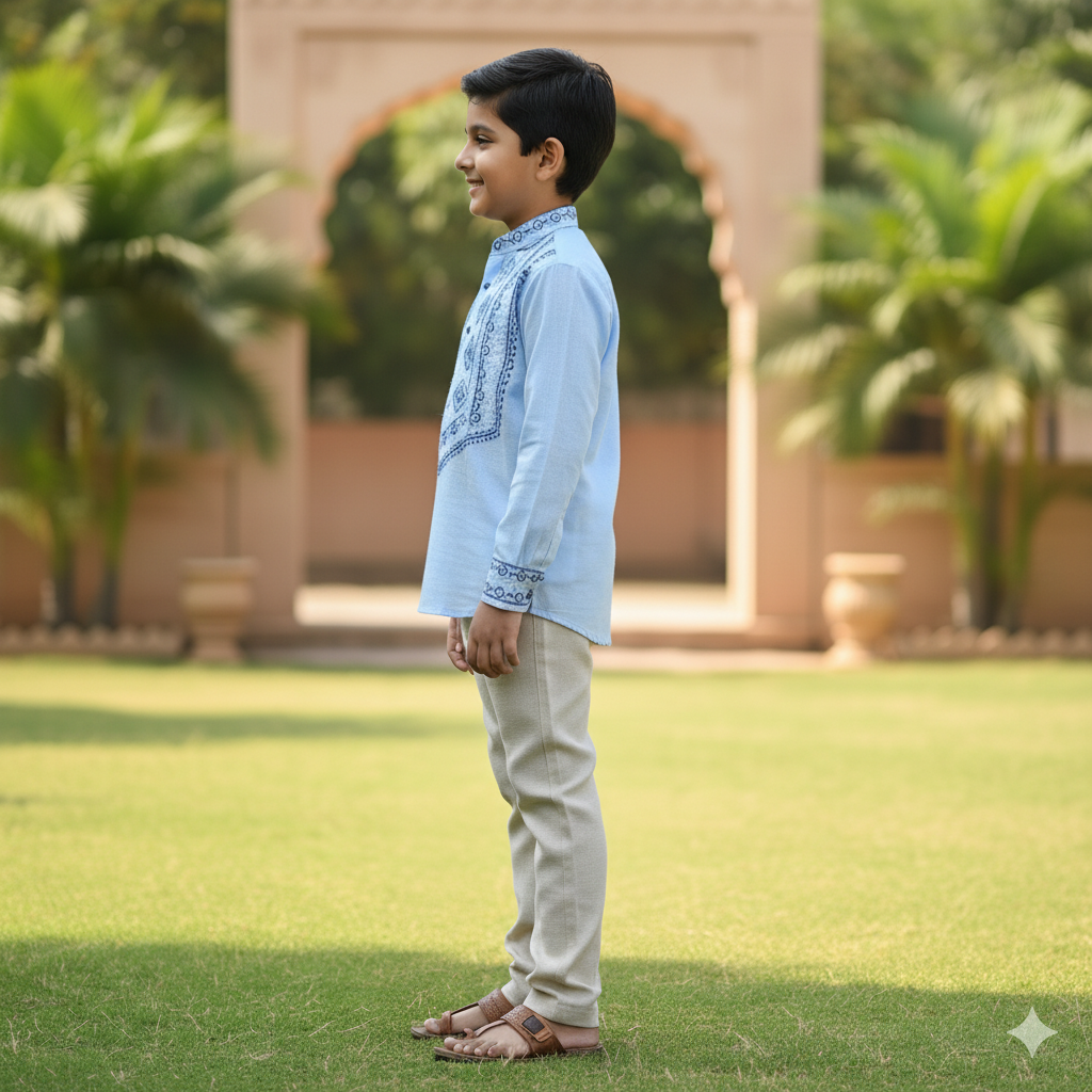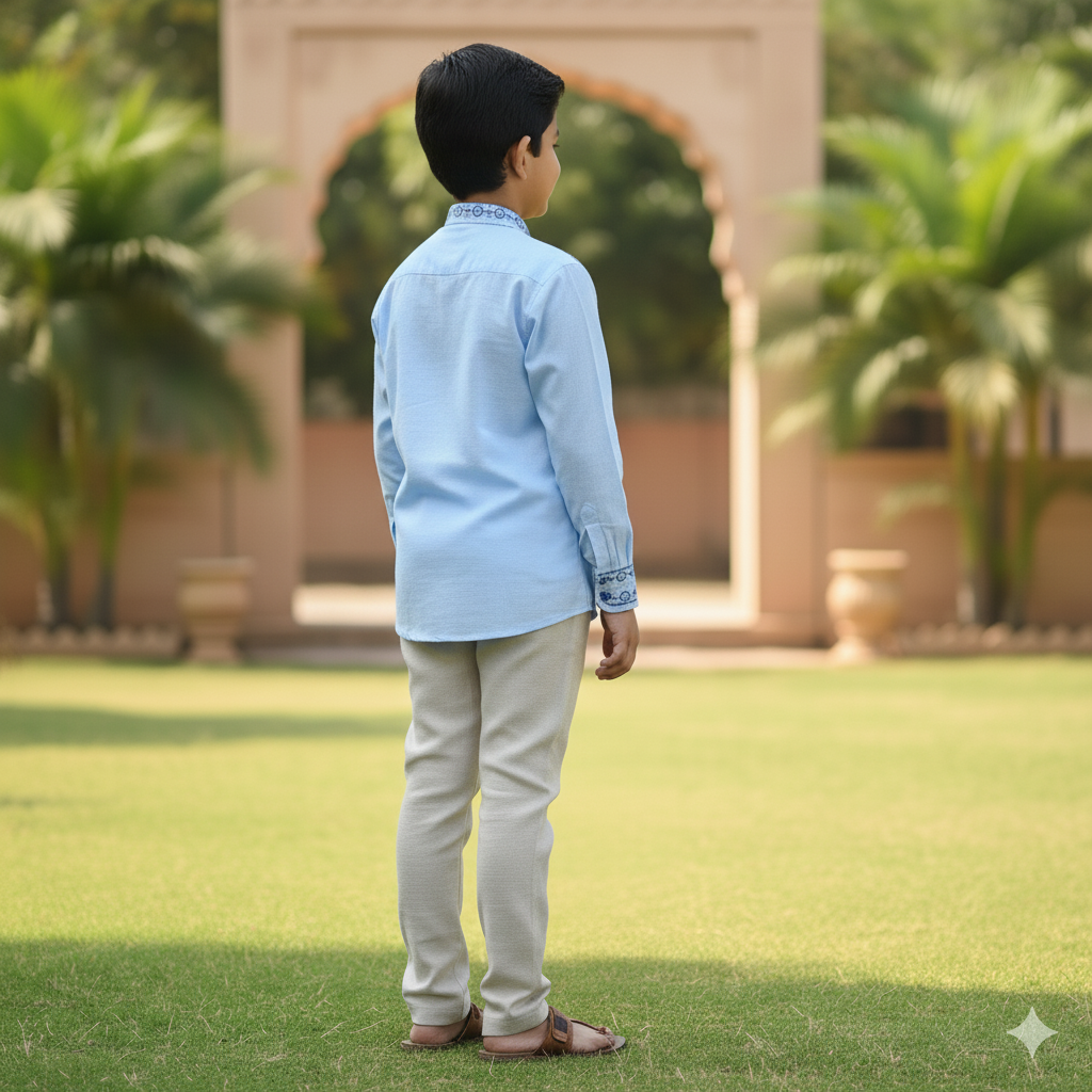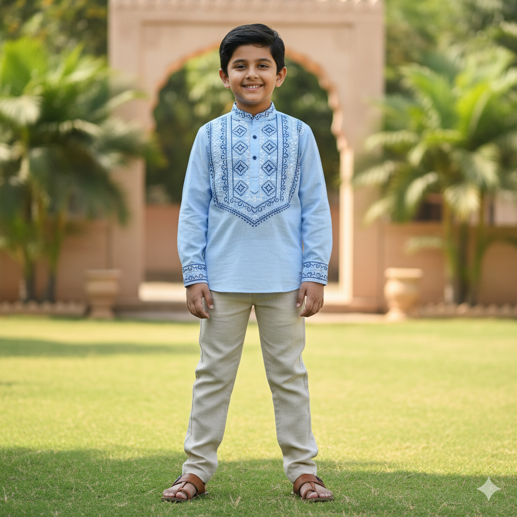 This embroidered detail shirt features embroidered details on chest and cuffs. Made from lightweight cotton, it’s perfect for casual outings and family events. Comfortable and stylish for all seasons. Made in India.