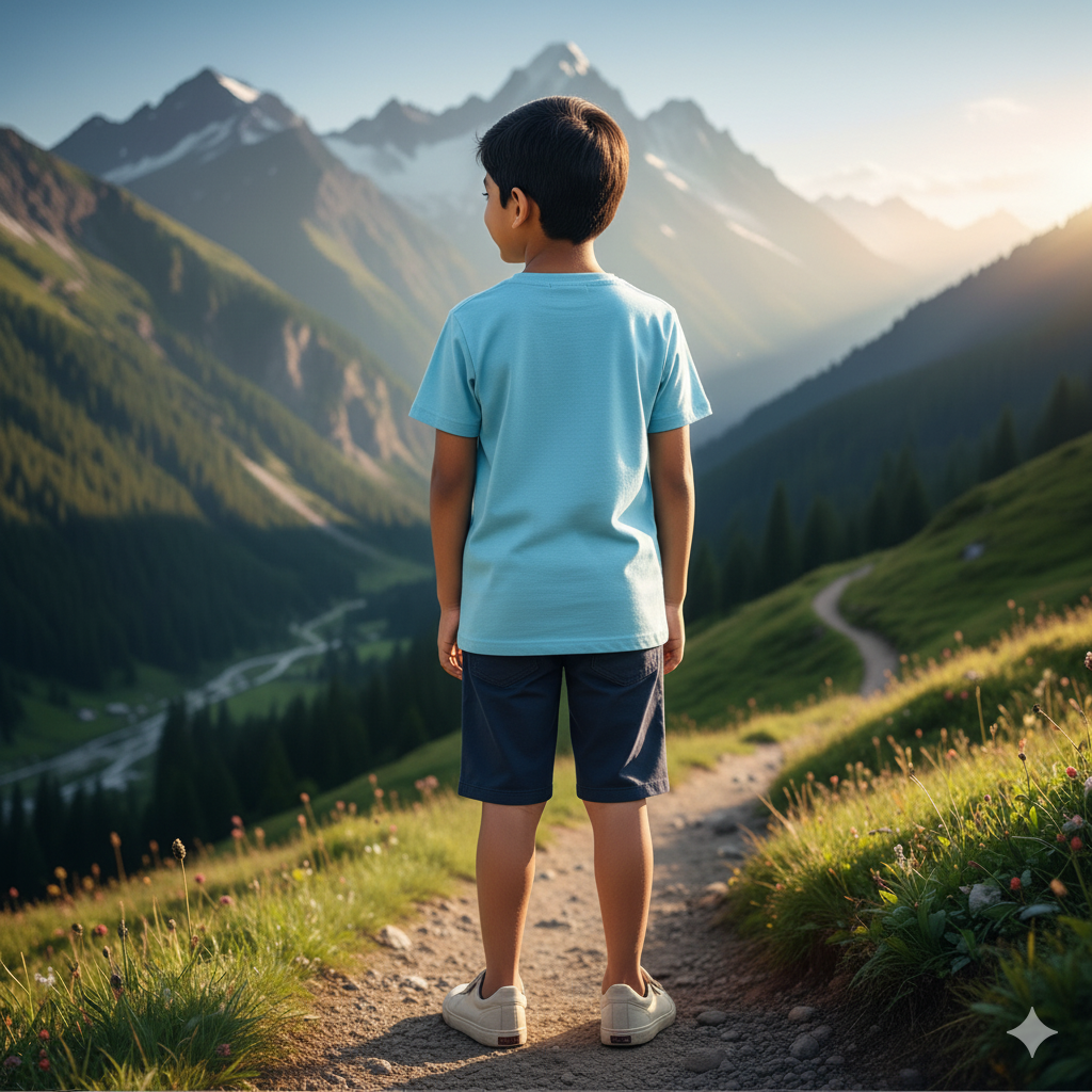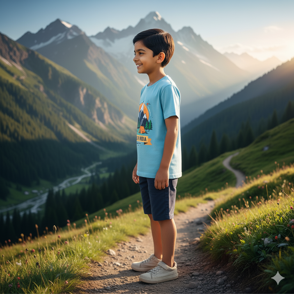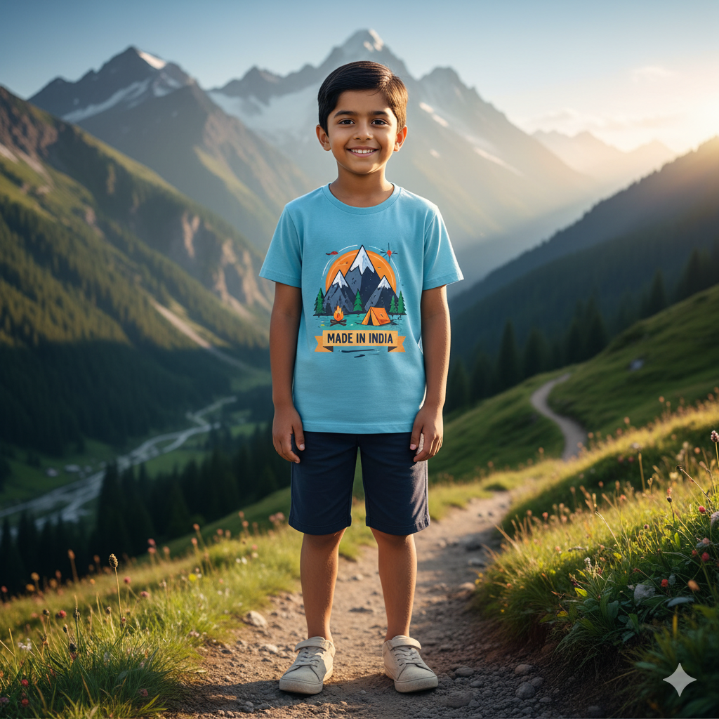 This mountain explorer T-shirt features mountain landscape and adventure theme. Made from soft cotton jersey, it’s designed to delight kids with playful graphics and durability. Perfect for school, play and everyday wear. Made in India.