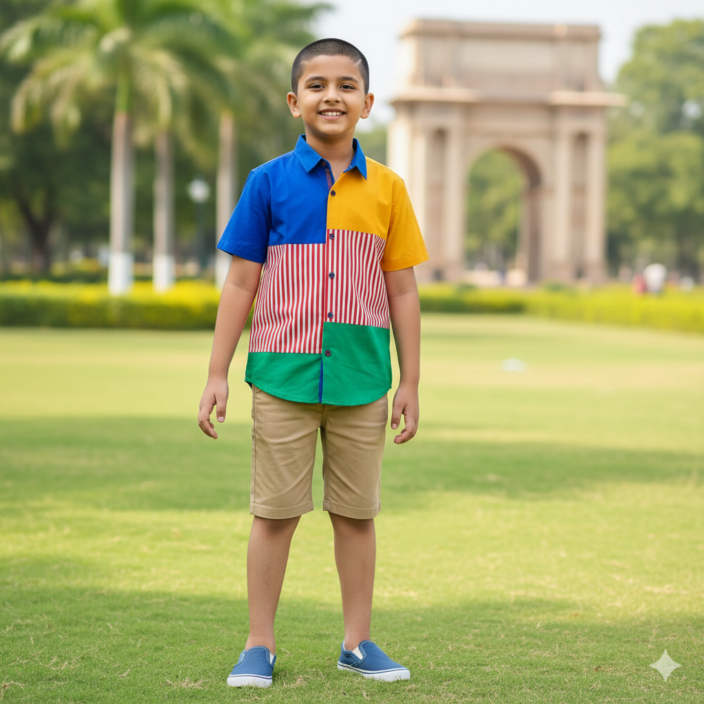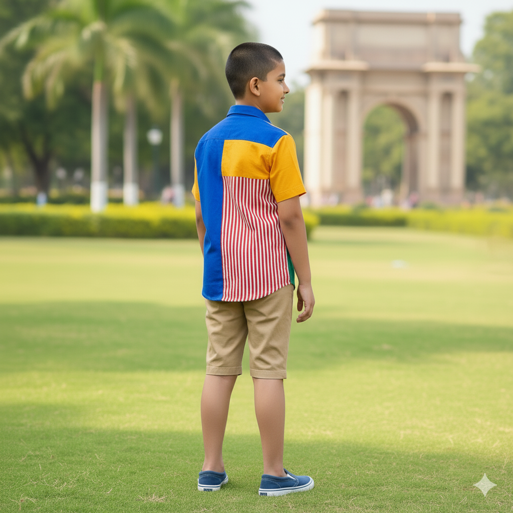 This striped colour block shirt features striped and solid colour blocking. Made from lightweight cotton, it’s perfect for casual outings and family events. Comfortable and stylish for all seasons. Made in India.