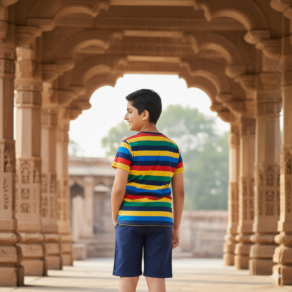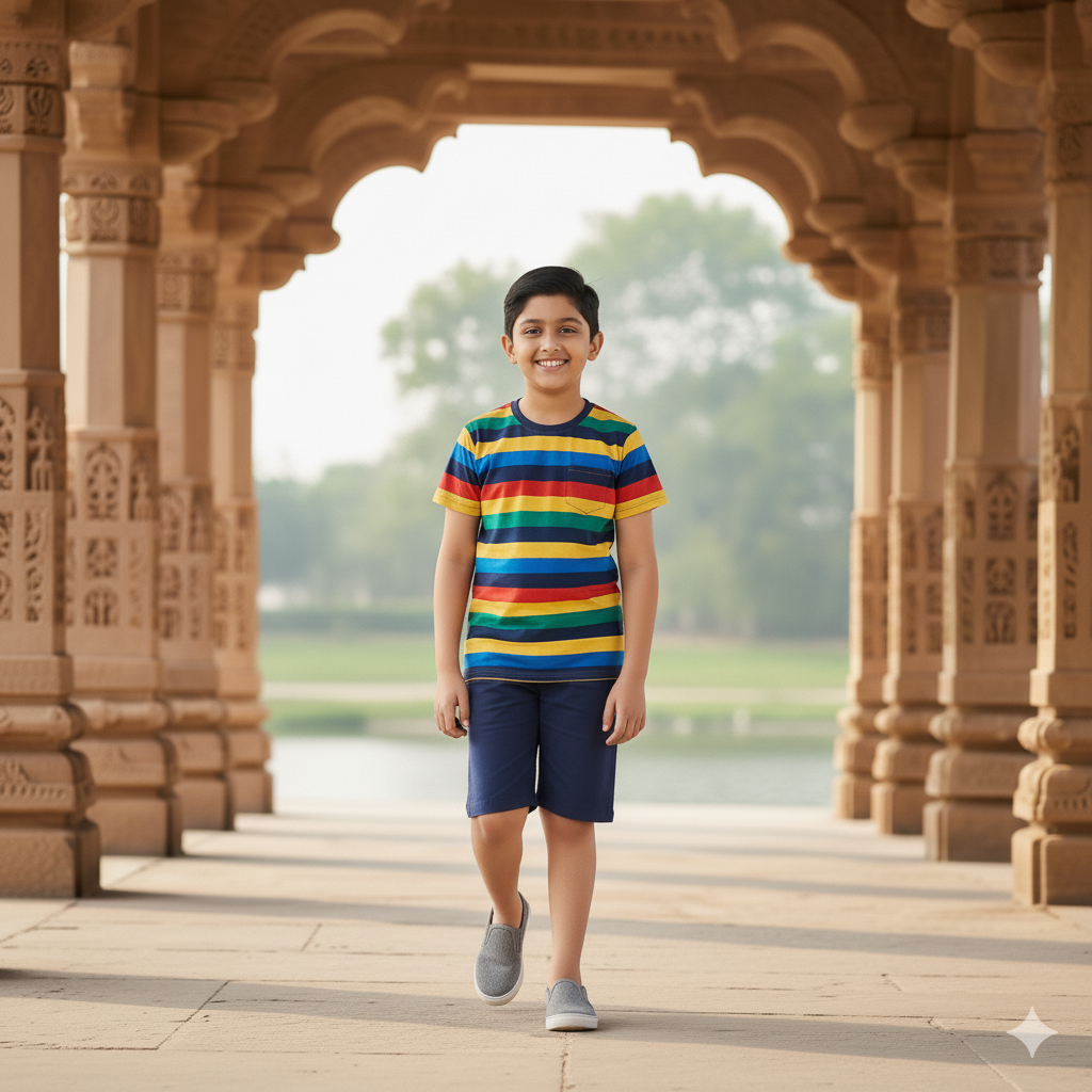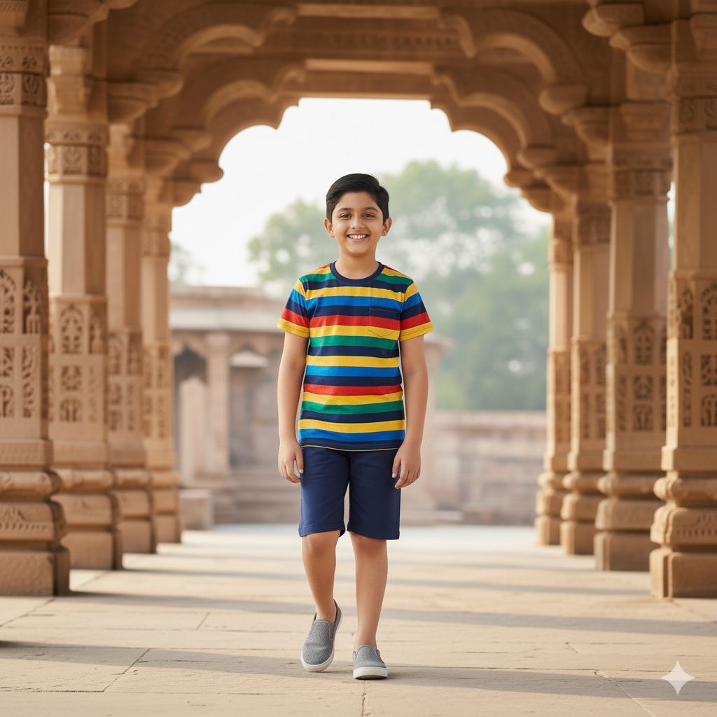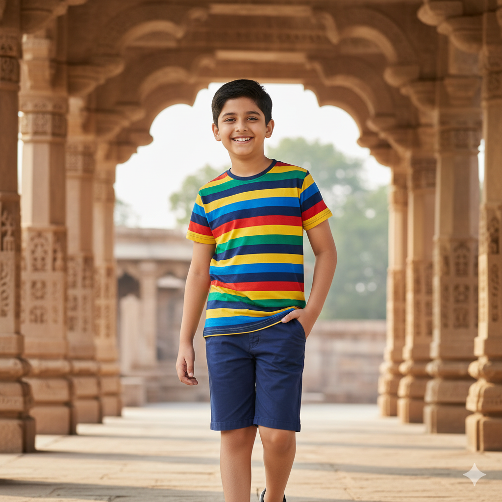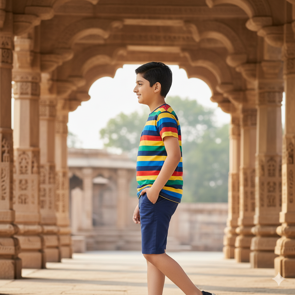 This striped combo set features striped shirt with contrast coloured shorts. Made from comfortable cotton blend, it’s perfect for active summer play and travel. Easy to mix and match. Made in India.