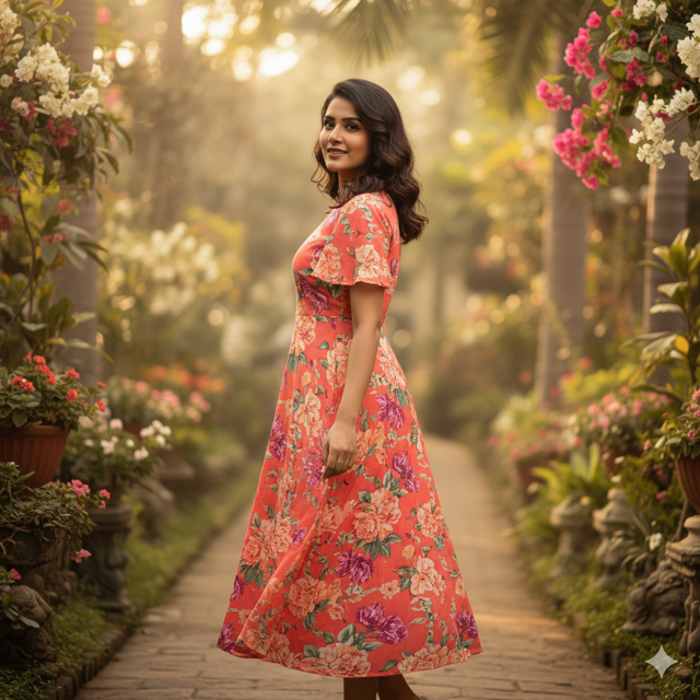 100% rayon (180 GSM), floral print, zip closure, midi length. Made in India.