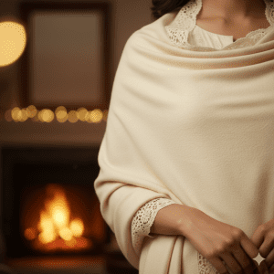 Soft cream wool stole with delicate lace borders for an elegant touch.