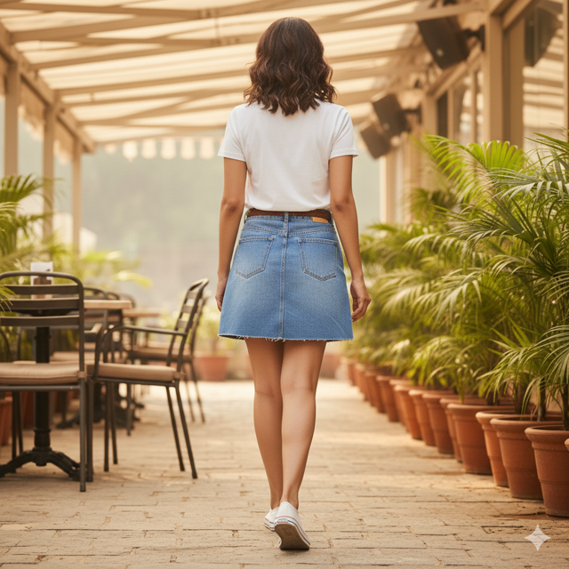 Cotton denim, short length, button front, trendy. Made in India.