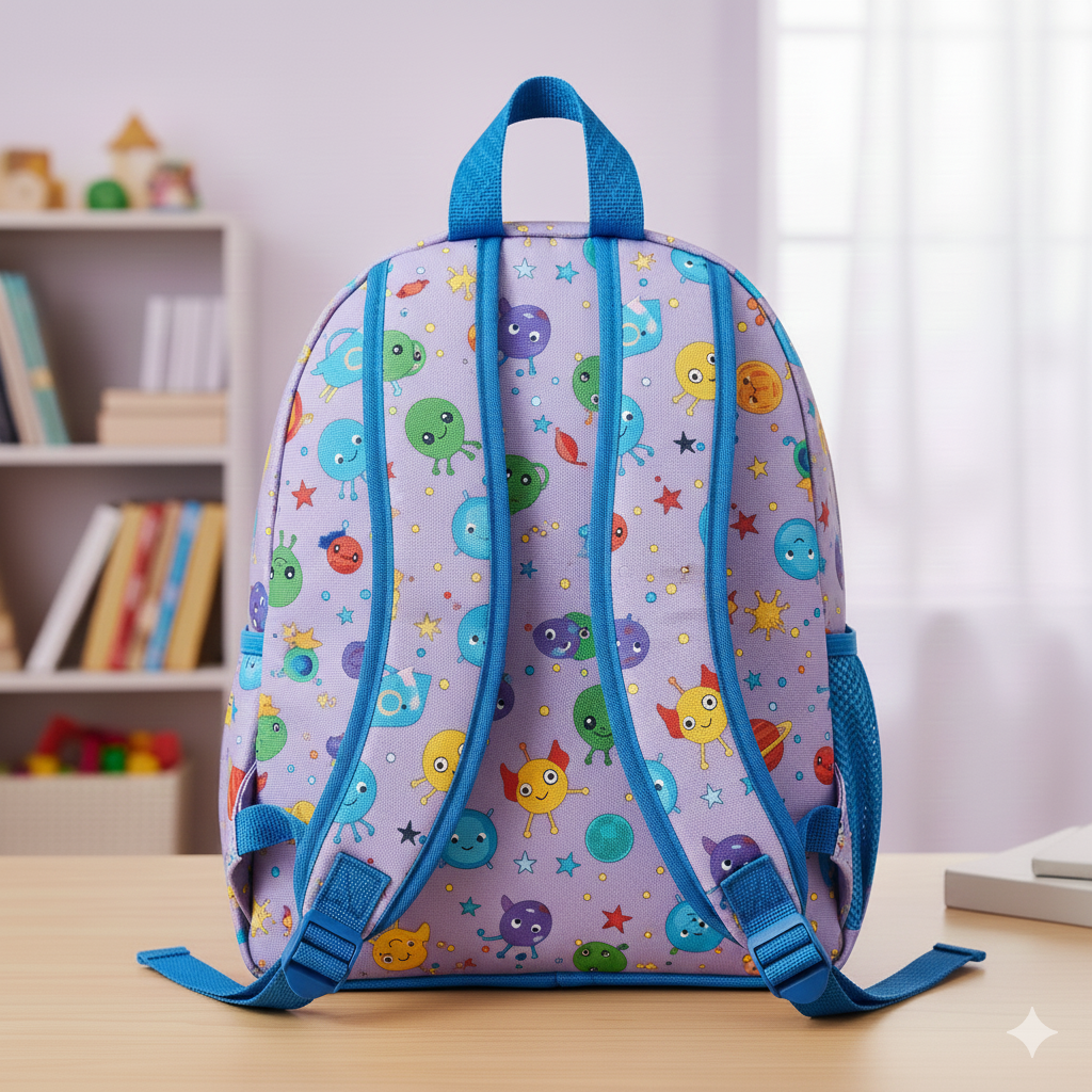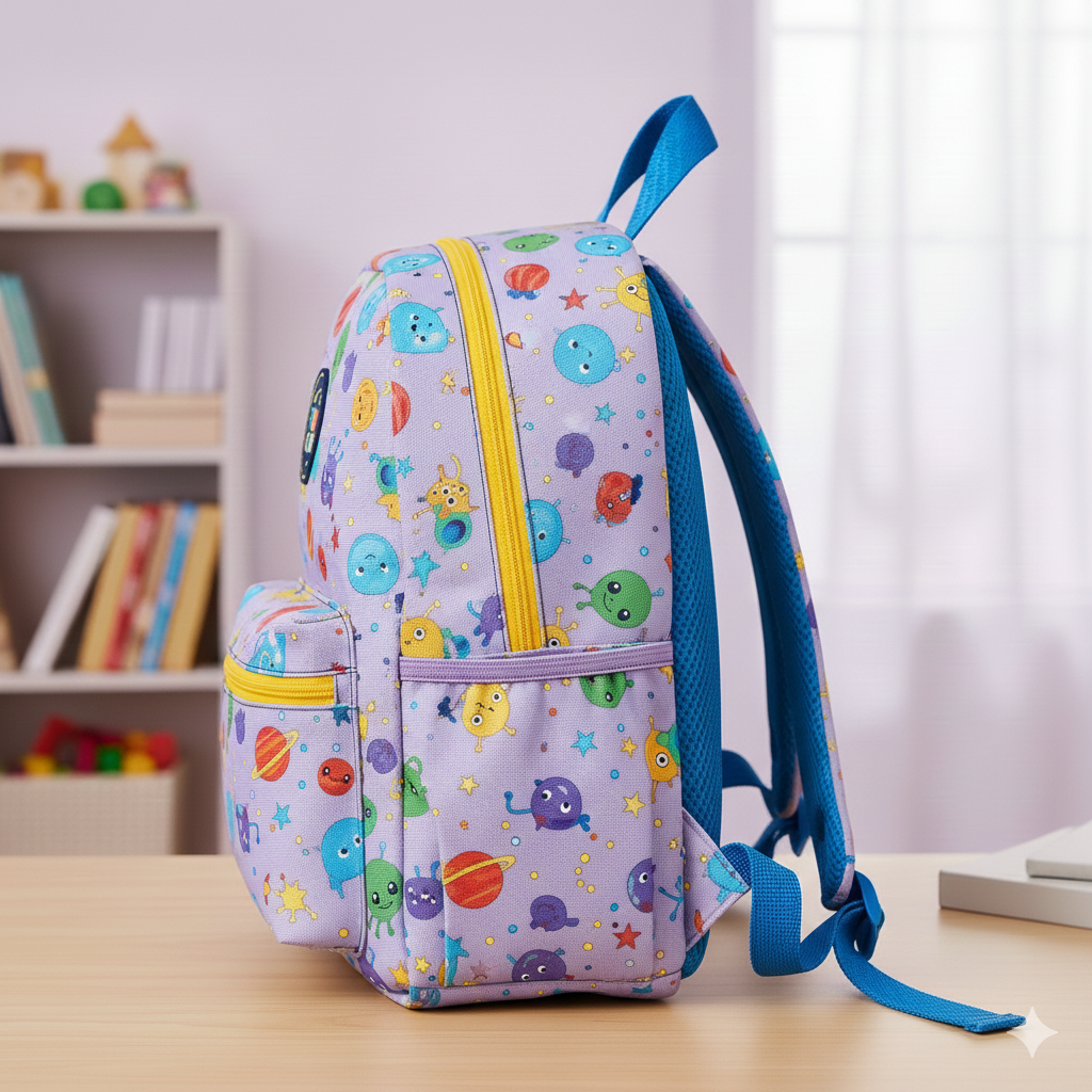 Lightweight backpack with playful graphic print and padded straps. Designed for junior school children. Made in India.