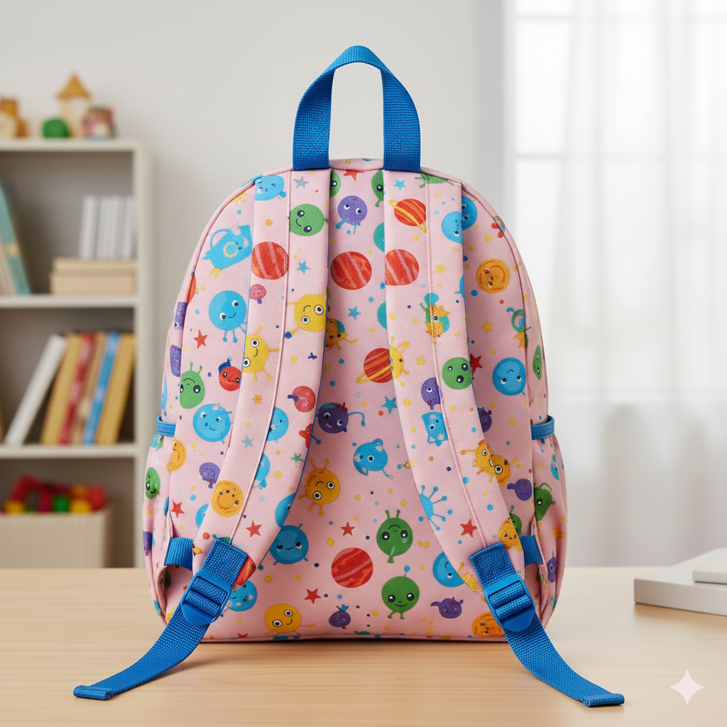 Lightweight backpack with playful graphic print and padded straps. Designed for junior school children. Made in India.