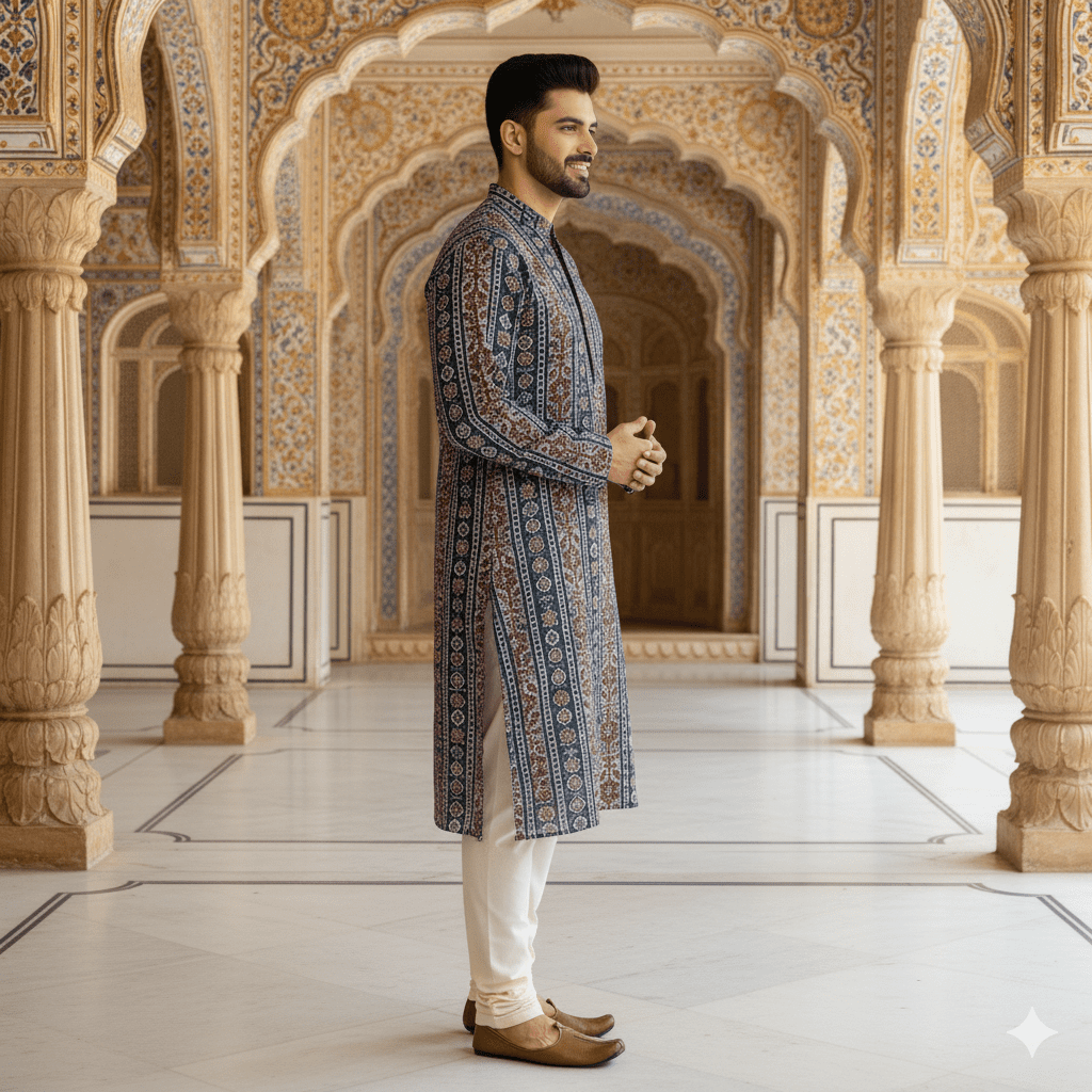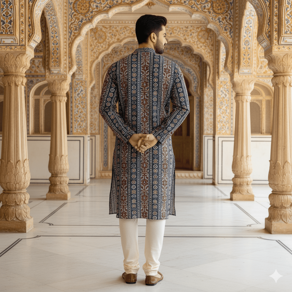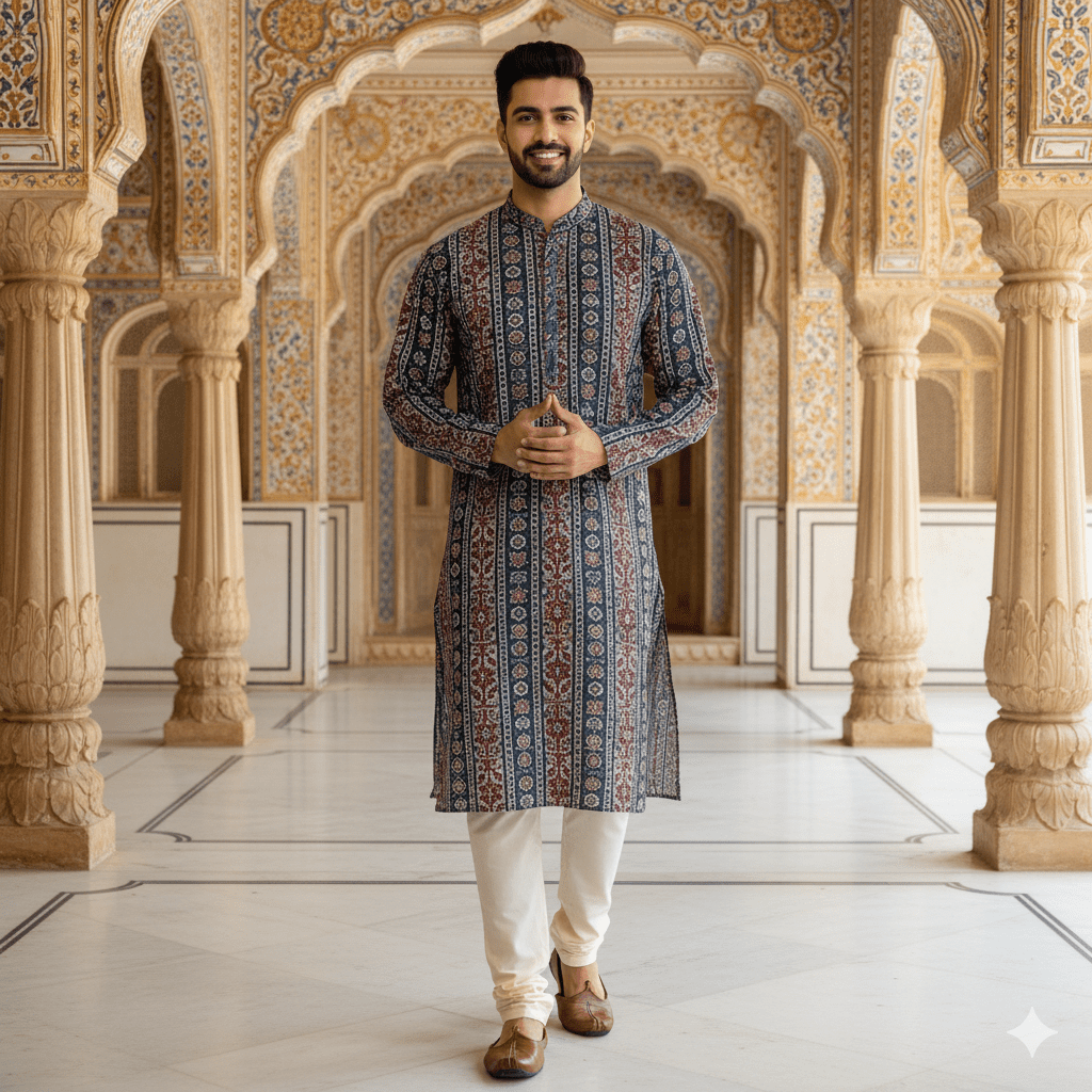 This Ajrakh print kurta features traditional Ajrakh double-sided block print. Crafted from lightweight premium fabric, it brings traditional elegance to festive occasions. Perfect for weddings, family functions and ethnic Fridays. Made in India.