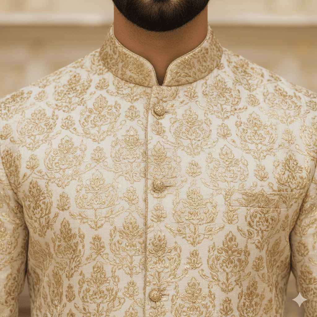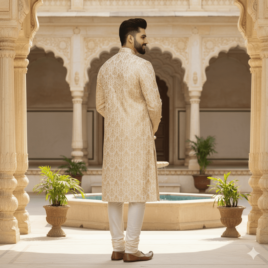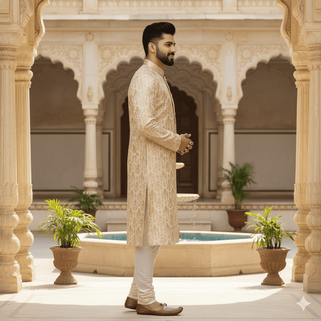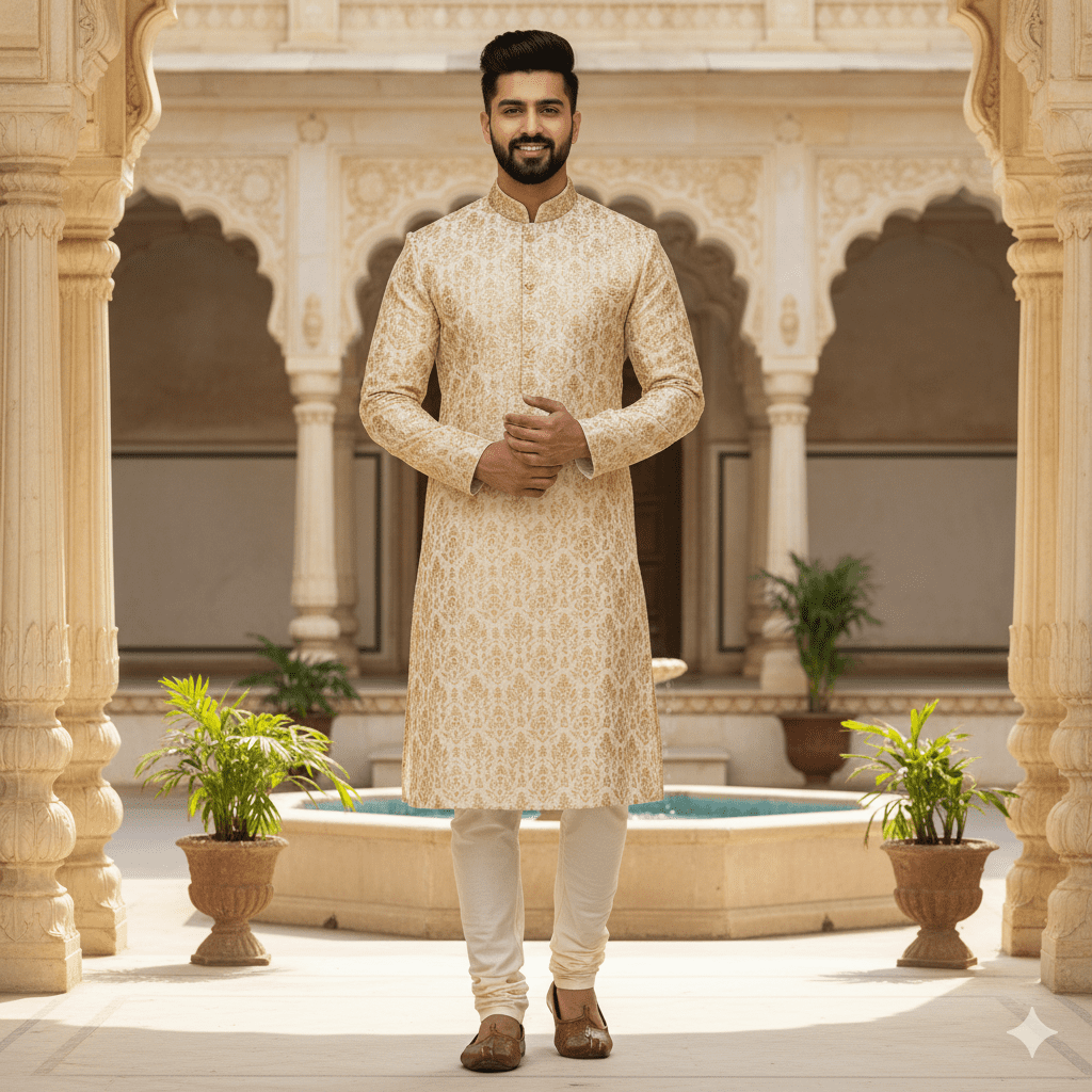This brocade pattern kurta features premium brocade with gold thread embroidery. Crafted from lightweight premium fabric, it brings traditional elegance to festive occasions. Perfect for weddings, family functions and ethnic Fridays. Made in India.