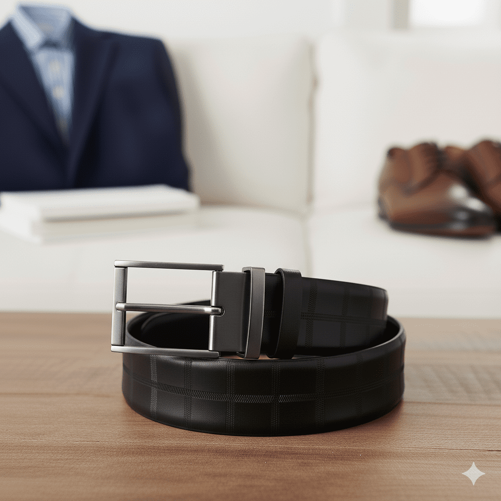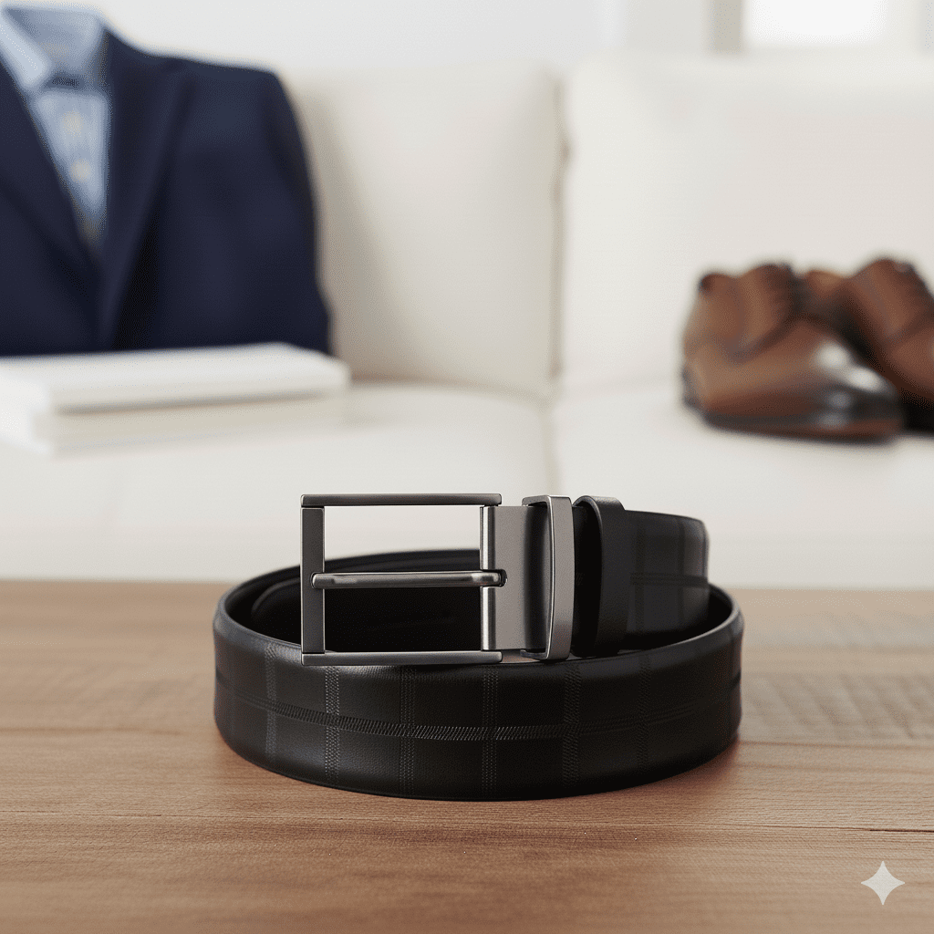 Smooth faux leather belt with elegant embossed pattern. Classic metal buckle finishes formal and smart-casual looks. Made in India.