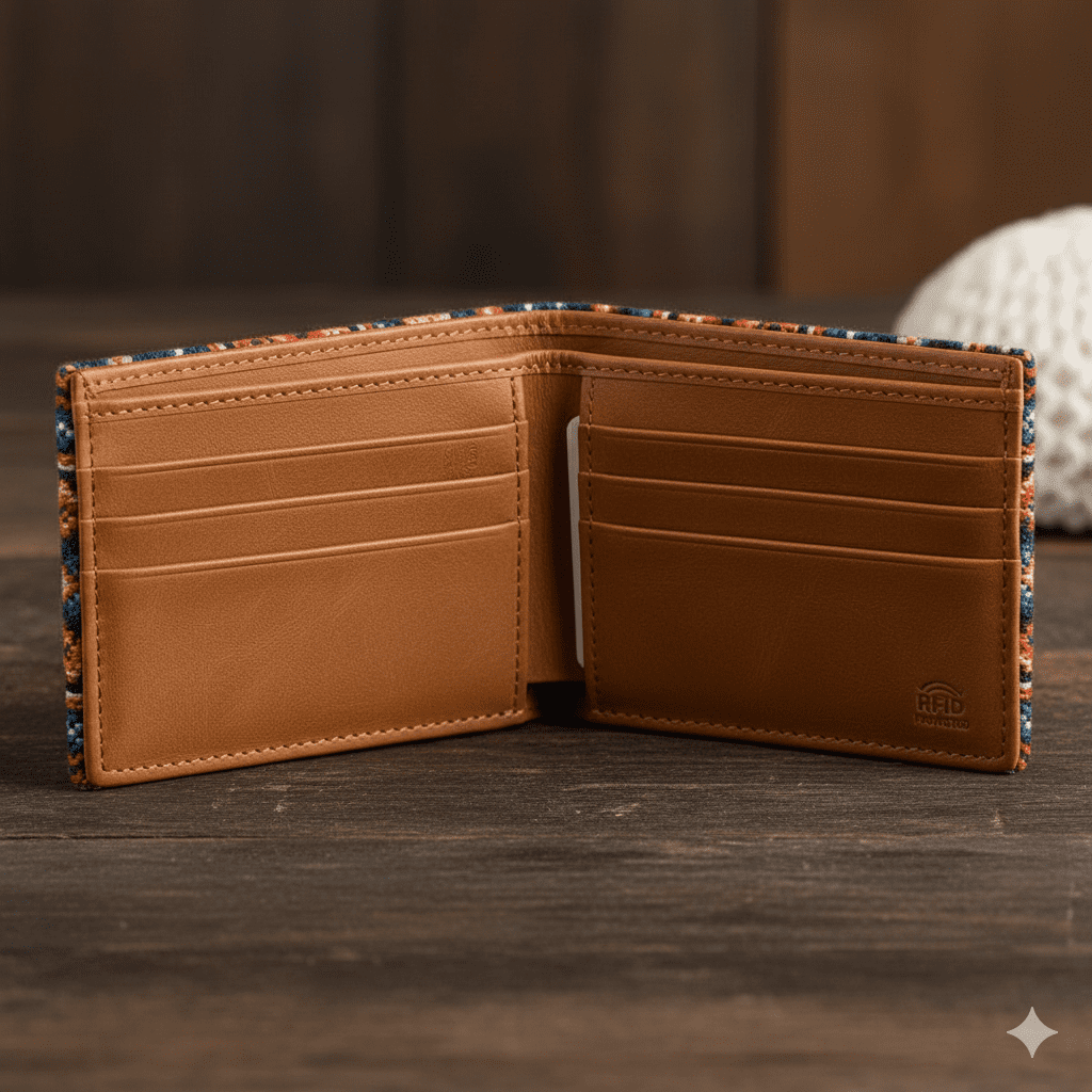 Faux leather wallet with traditional embroidery detailing. Multiple card slots and RFID protection. Made in India.