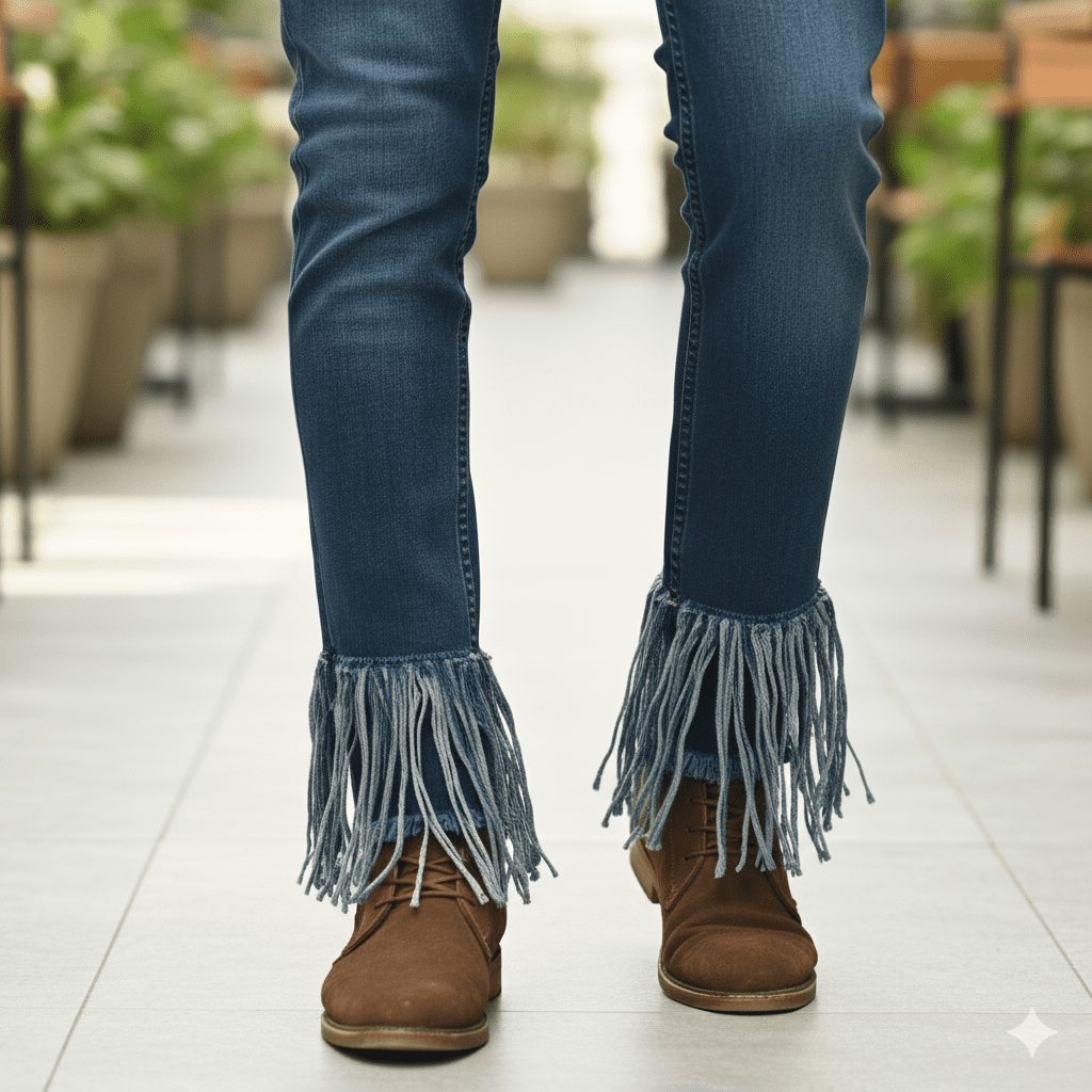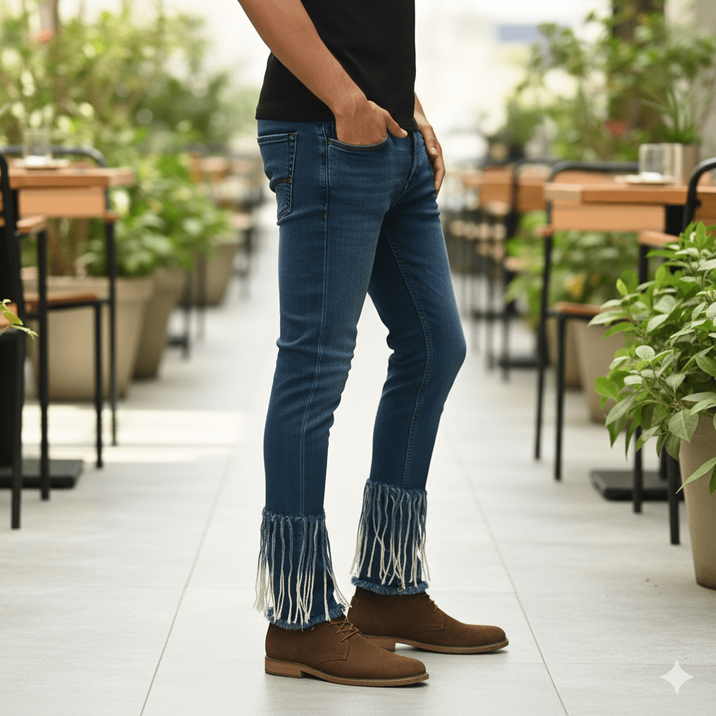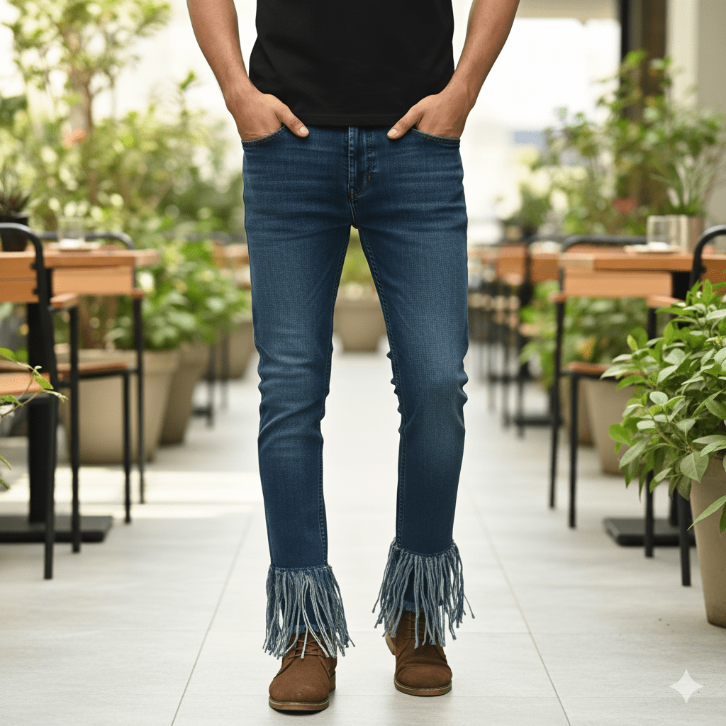 This frayed hem jeans features trendy frayed hemline with raw edge. Made from premium stretch denim blend, it offers comfortable fit and distinctive style. Perfect for daily wear and casual outings. Made in India.