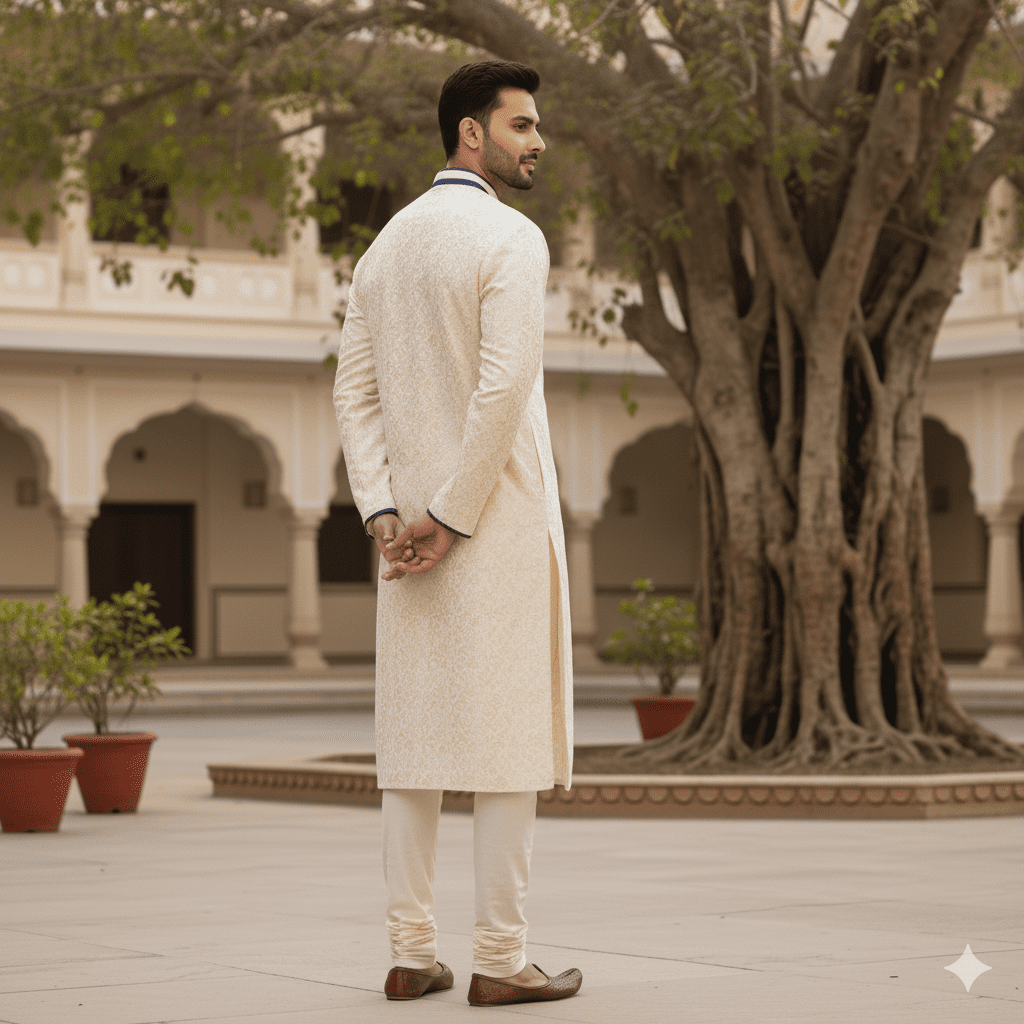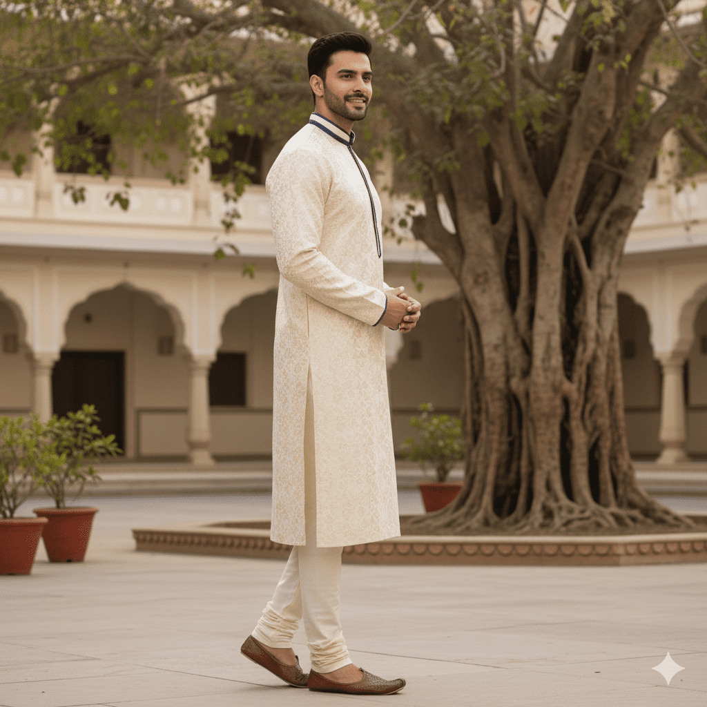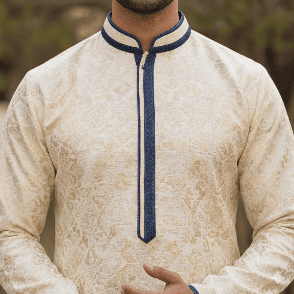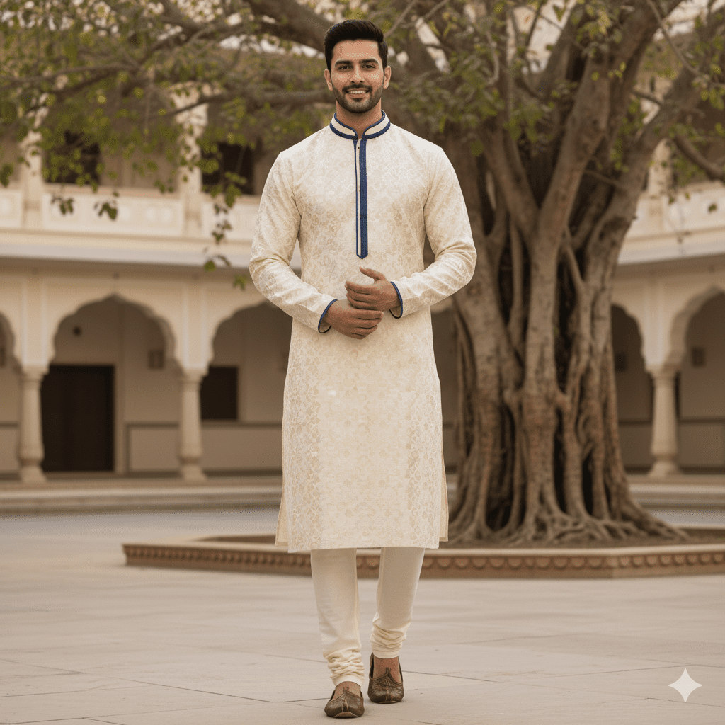 This geometric jacquard kurta features modern geometric jacquard weave. Crafted from lightweight premium fabric, it brings traditional elegance to festive occasions. Perfect for weddings, family functions and ethnic Fridays. Made in India.