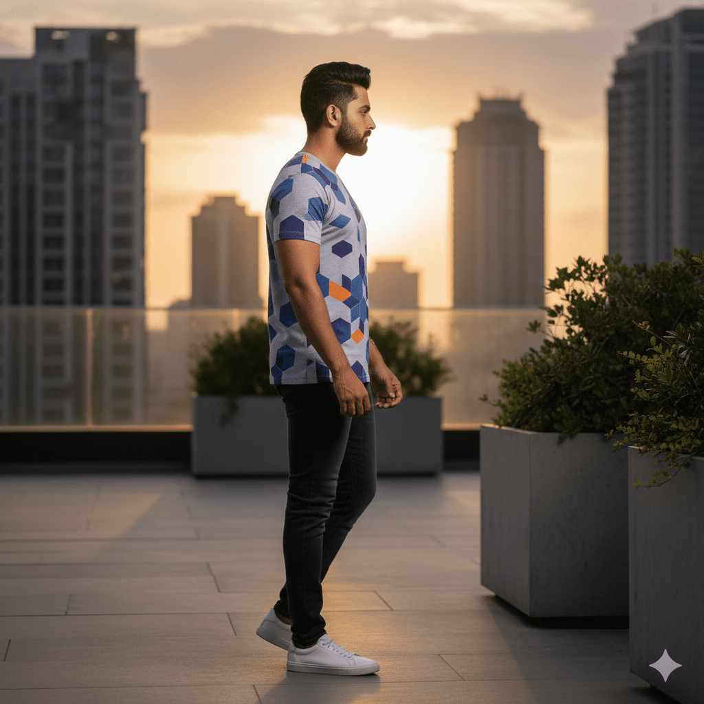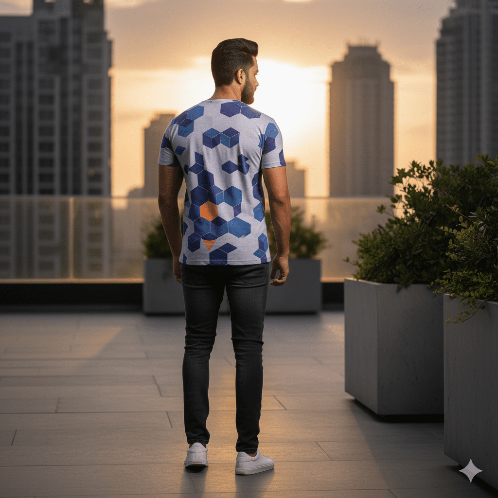 This geometric pattern T-shirt features an eye-catching geometric print with hexagon and triangle patterns. Crafted from soft breathable cotton with premium print quality, it stands out with its distinctive pattern and finish. Perfect for daily casual wear in Indian weather. Made in India.