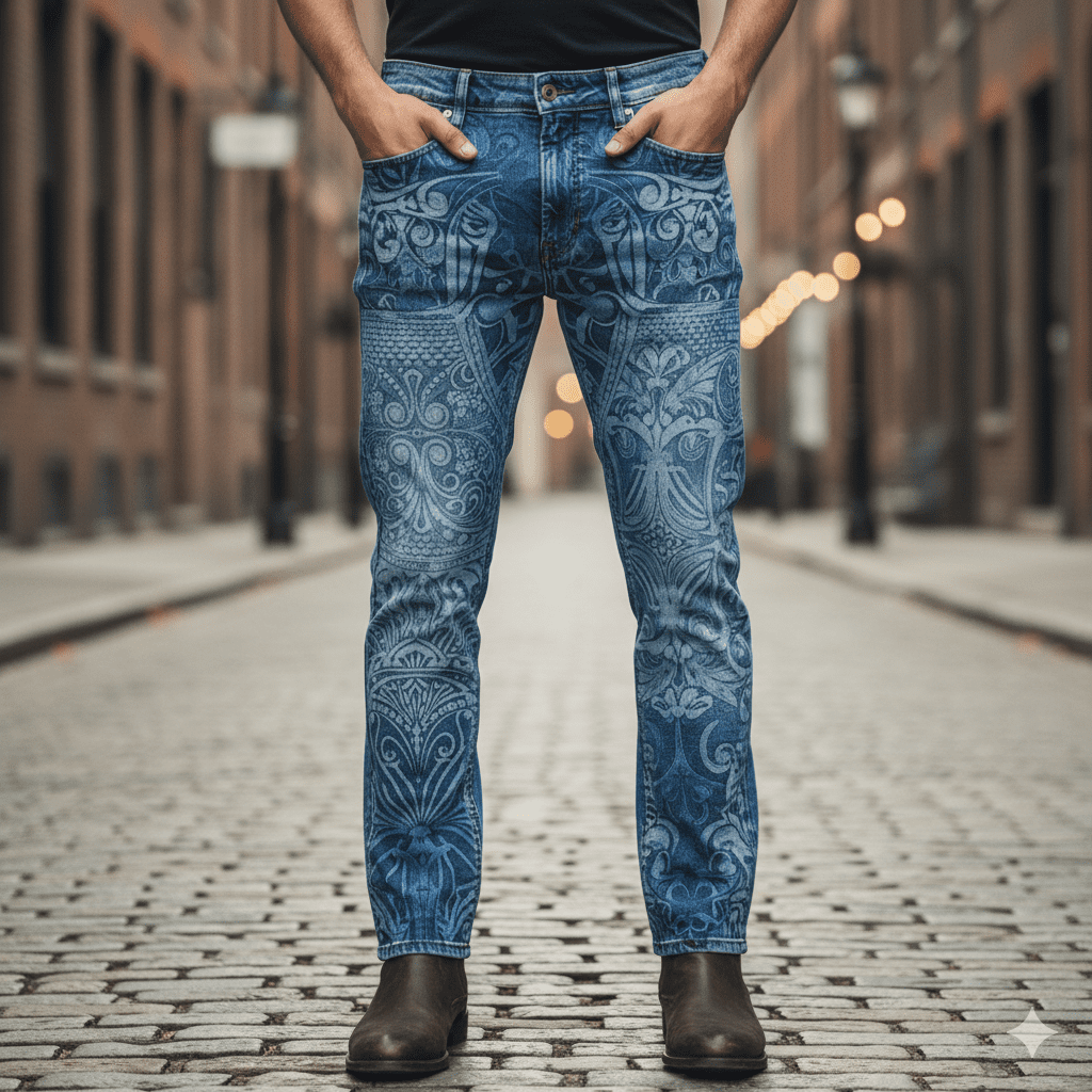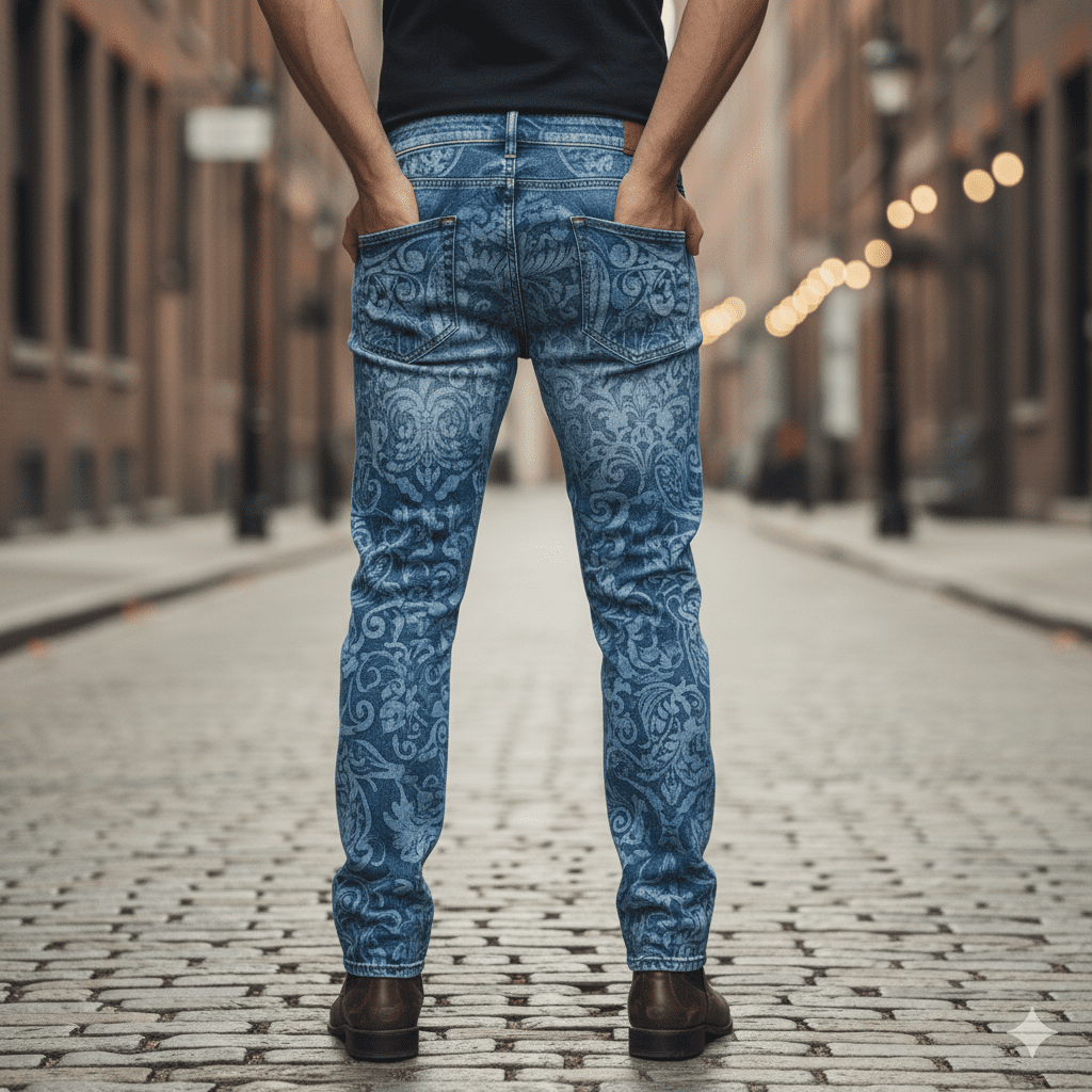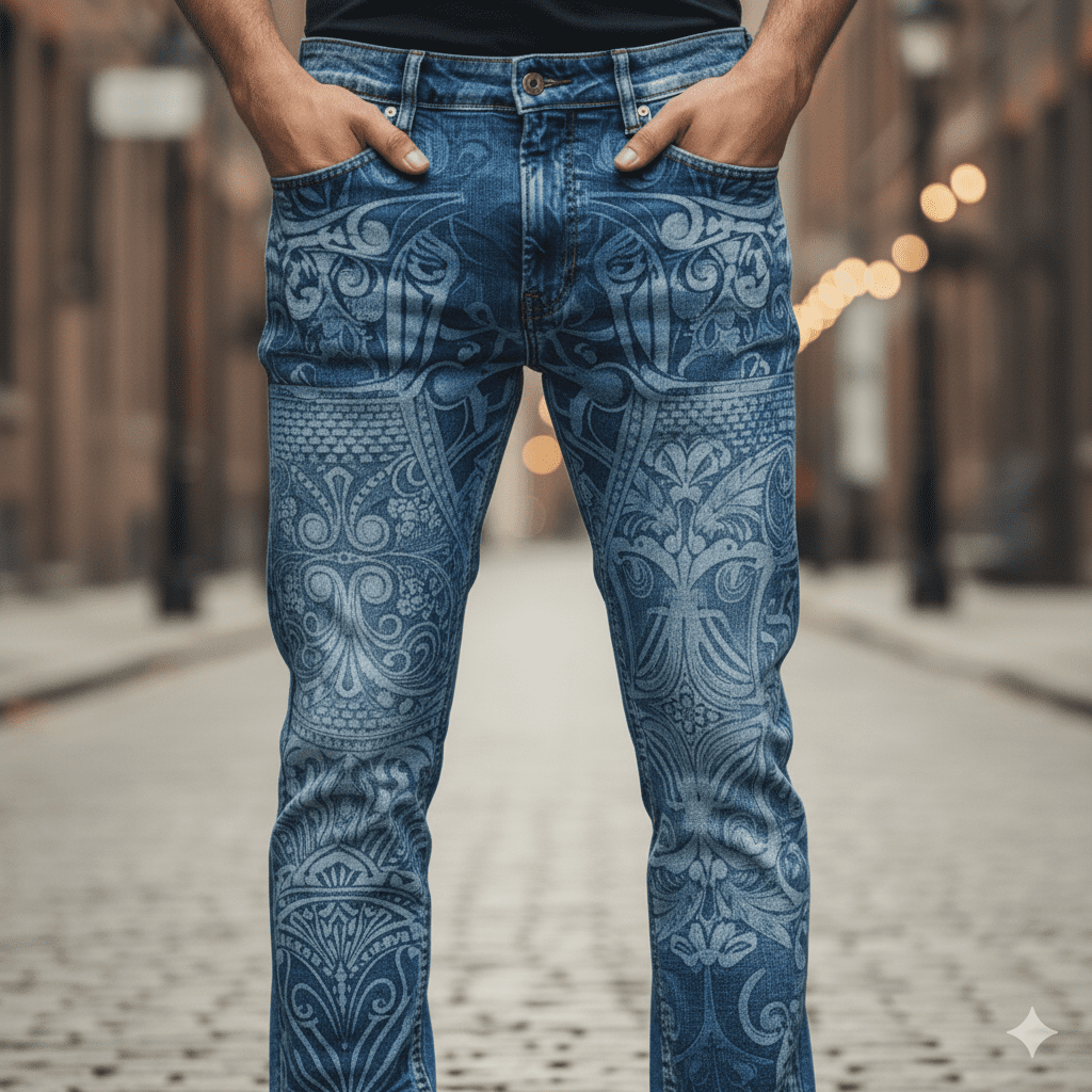 This laser print jeans features laser-printed design with unique graphics. Made from premium stretch denim blend, it offers comfortable fit and distinctive style. Perfect for daily wear and casual outings. Made in India.