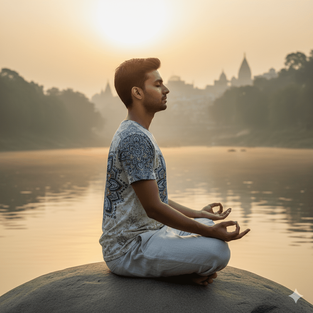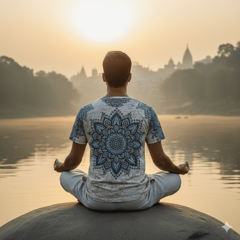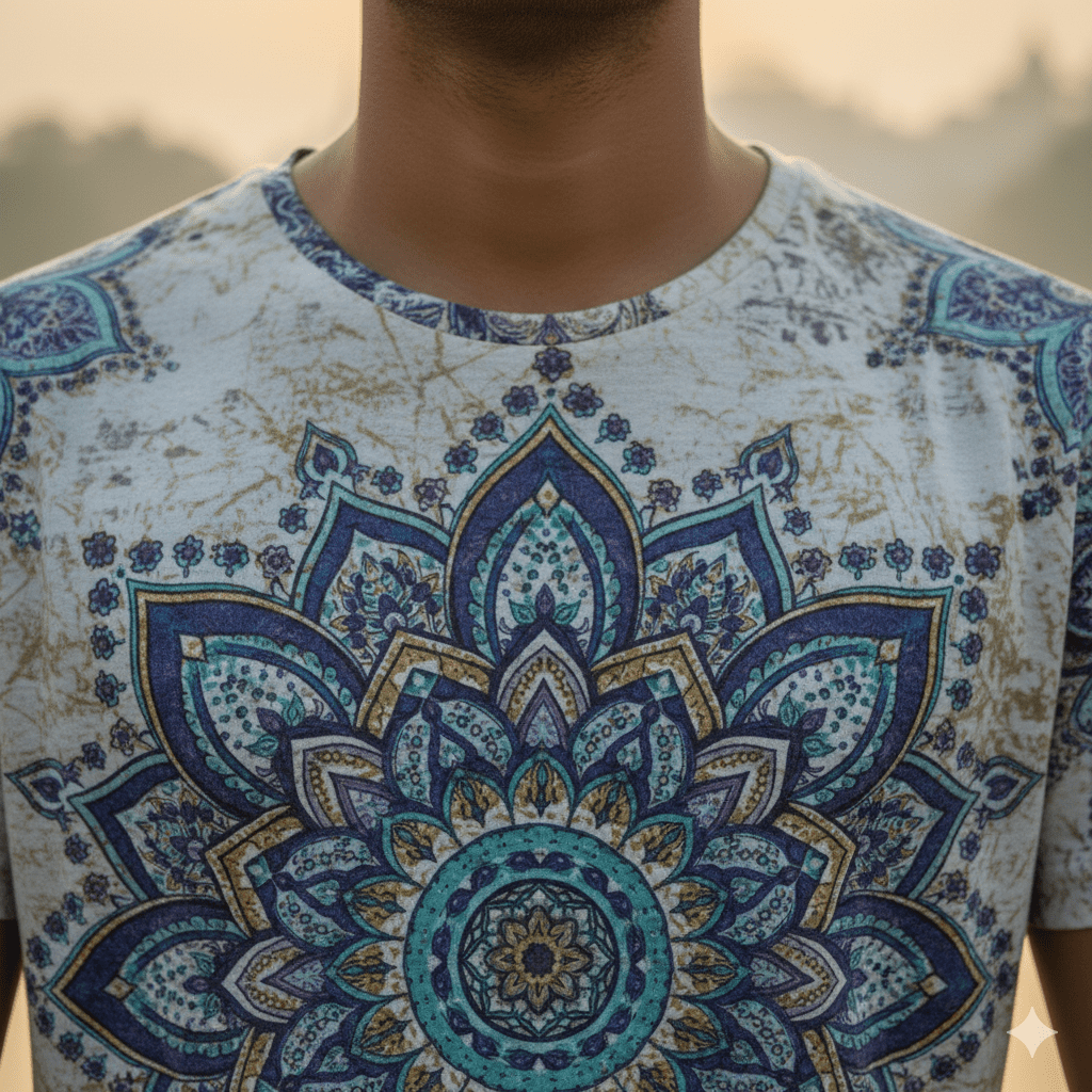 This mandala print T-shirt features an intricate mandala pattern with spiritual vibes. Crafted from soft breathable cotton with premium print quality, it stands out with its distinctive pattern and finish. Perfect for daily casual wear in Indian weather. Made in India.