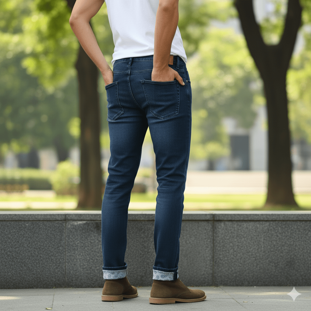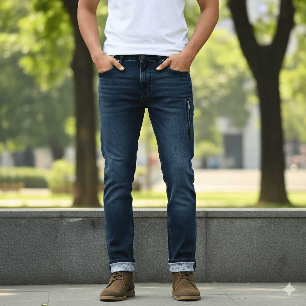 This reversible cuff jeans features reversible cuff with hidden pocket. Made from premium stretch denim blend, it offers comfortable fit and distinctive style. Perfect for daily wear and casual outings. Made in India.