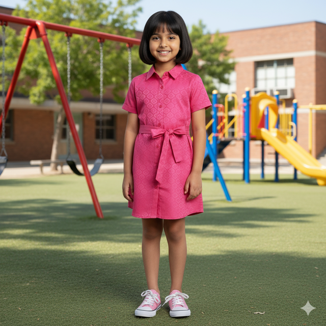 Cotton-polyester blend (190 GSM), crisp and durable. Classic pink horizontal stripes, button-front closure, collared neckline, side slip pockets, curved hemline. Fabric: Wrinkle-resistant blend for easy care. Care: Machine wash warm (40°C). Iron on medium if needed. Stain resistant finish. Perfect for school, casual outings, and daily wear. Made in India.