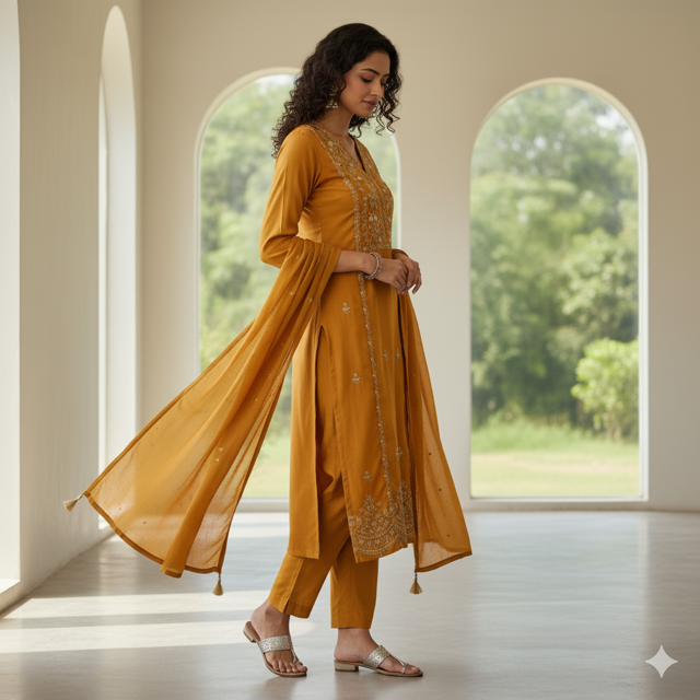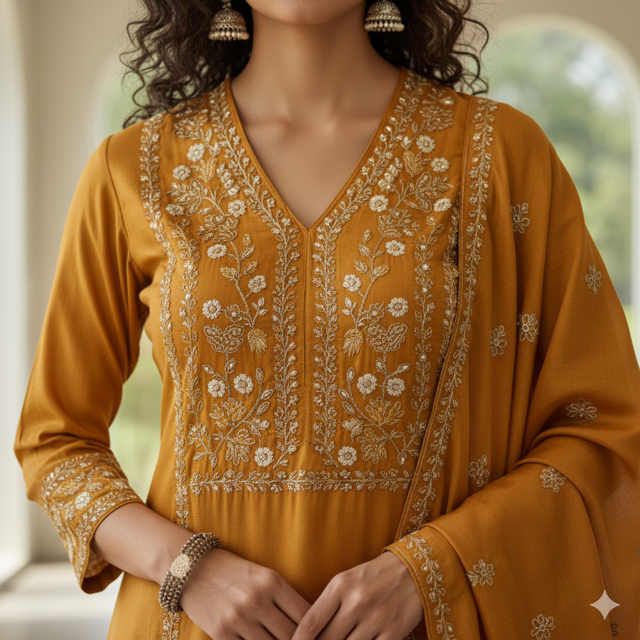 Silk blend (240 GSM), embroidered, kurta with matching pants. Made in India.
