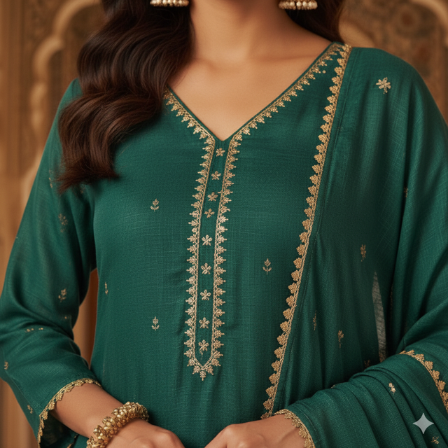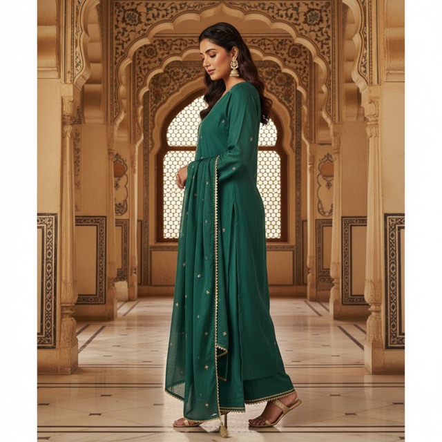 Chanderi silk-cotton (200 GSM), kurta with matching pants, gota lace. Made in India.