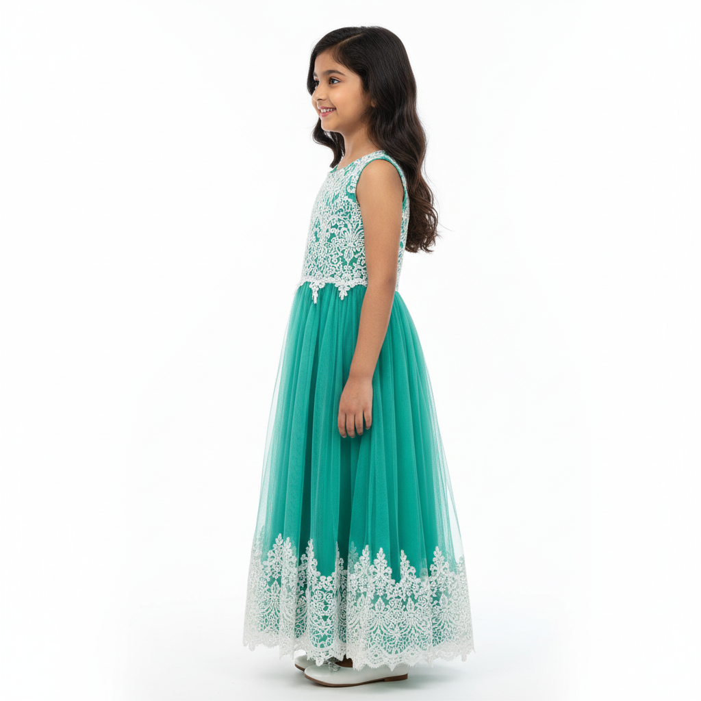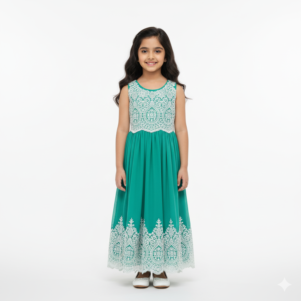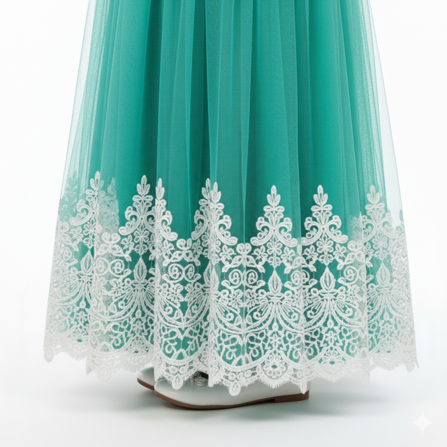 Cotton base (170 GSM) with premium French lace overlay in a lively Teal. Features back zip closure, soft inner cotton lining, and subtle sheen. Lace: Delicate lace pattern. Care: Dry clean or hand wash cold (25°C). Gently squeeze water out. Lay flat to dry. Do not wring. Perfect for weddings, special occasions, and formal events. Made in India.