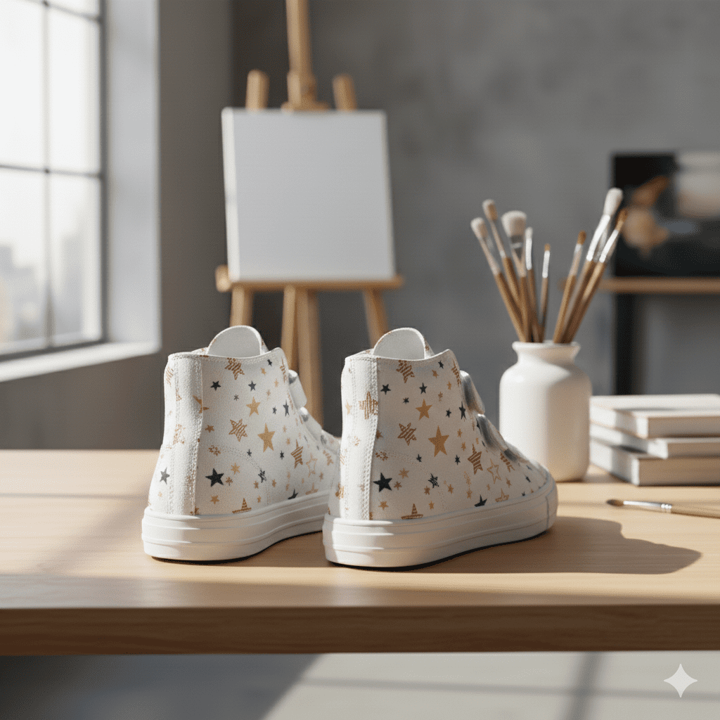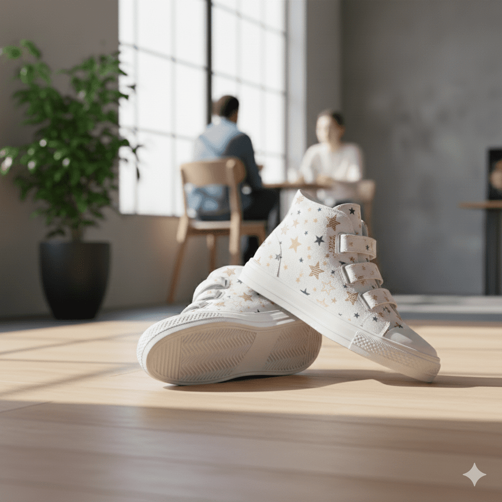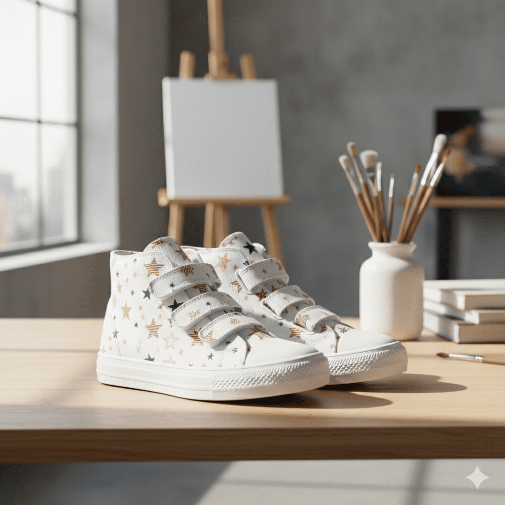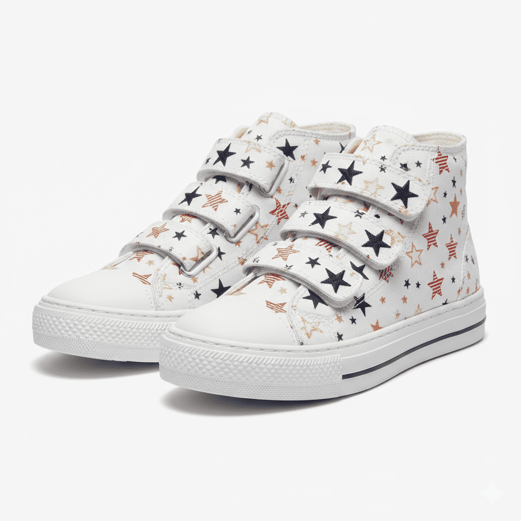 Soft knit-backed canvas with Stars print. Velcro closure with cushioned sole for all-day comfort. Made in India.