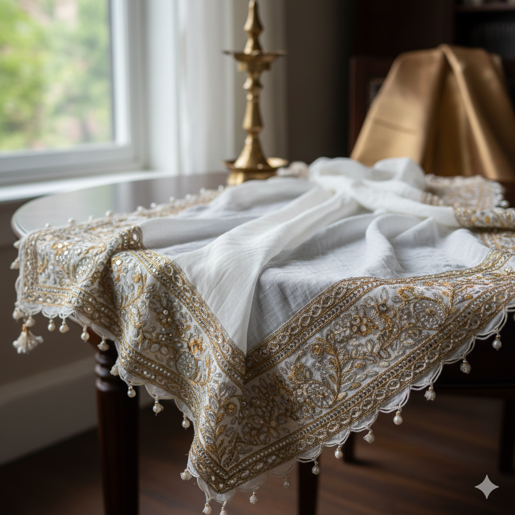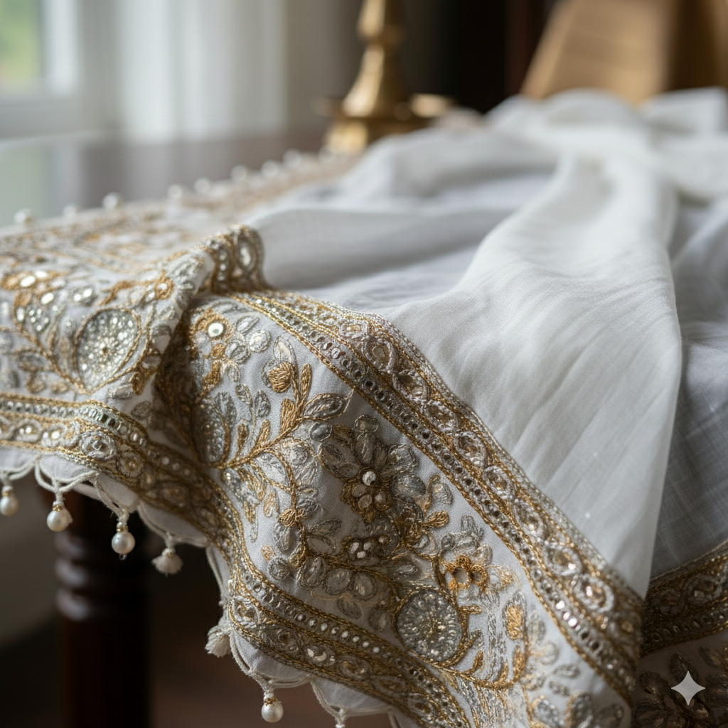 Sheer chiffon dupatta with delicate embroidered border. Perfect for ethnic and festive occasions. Made in India.