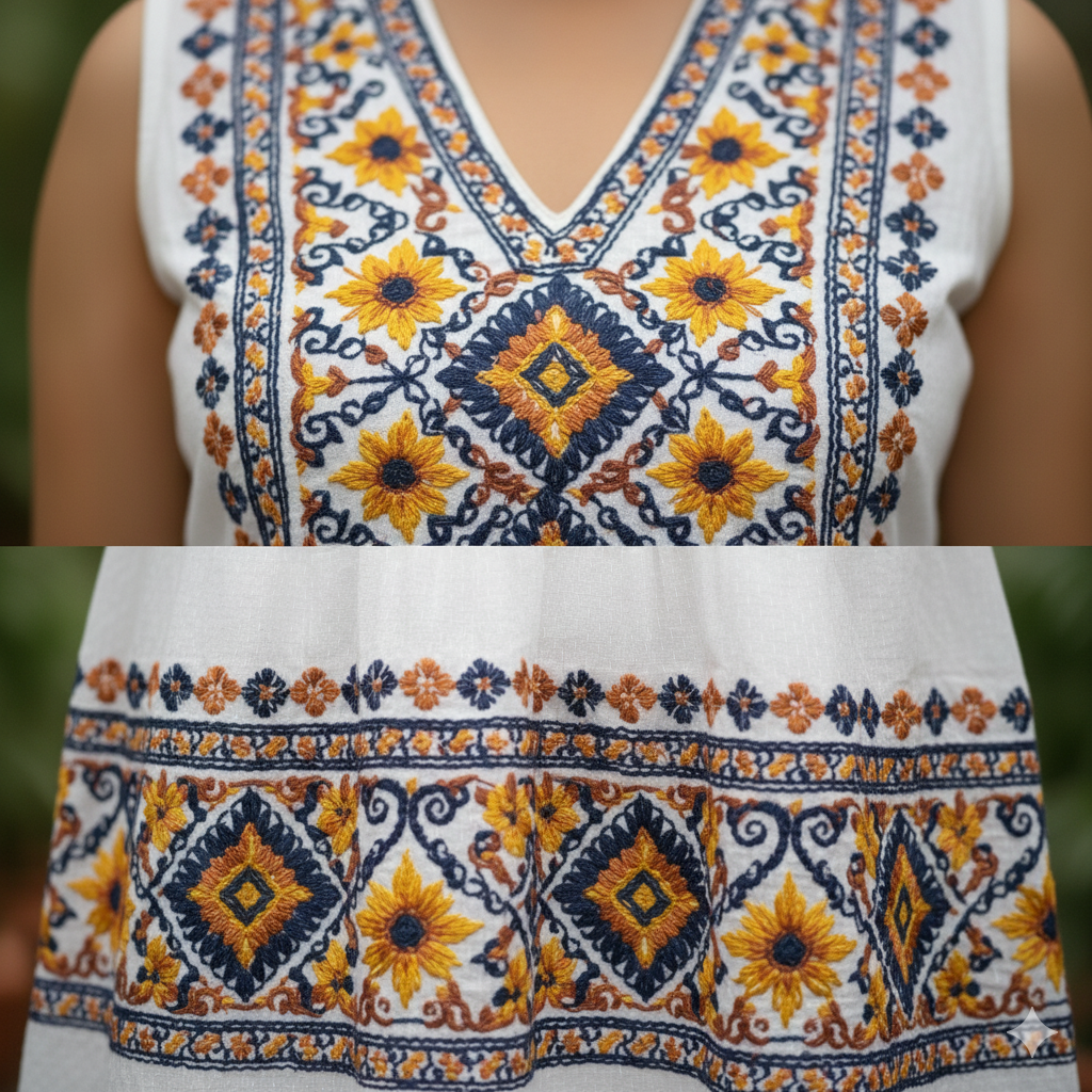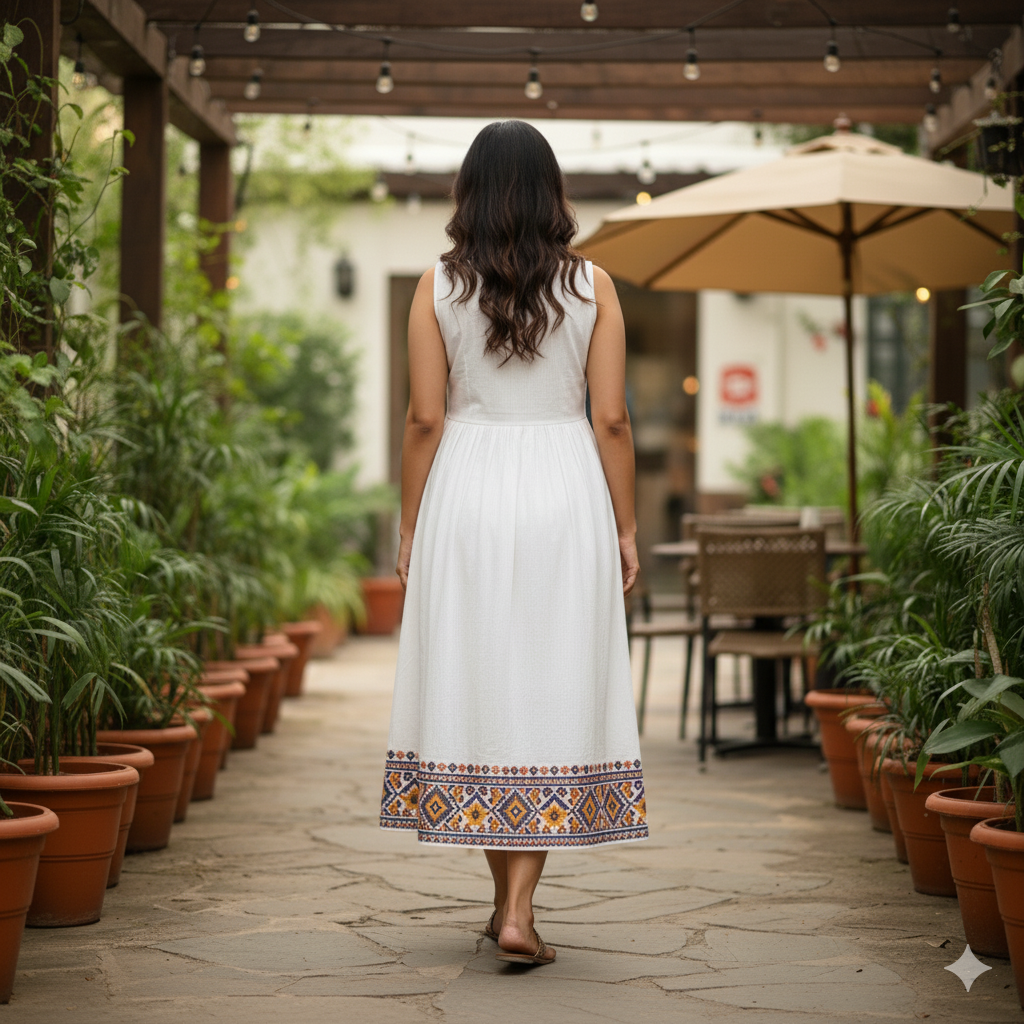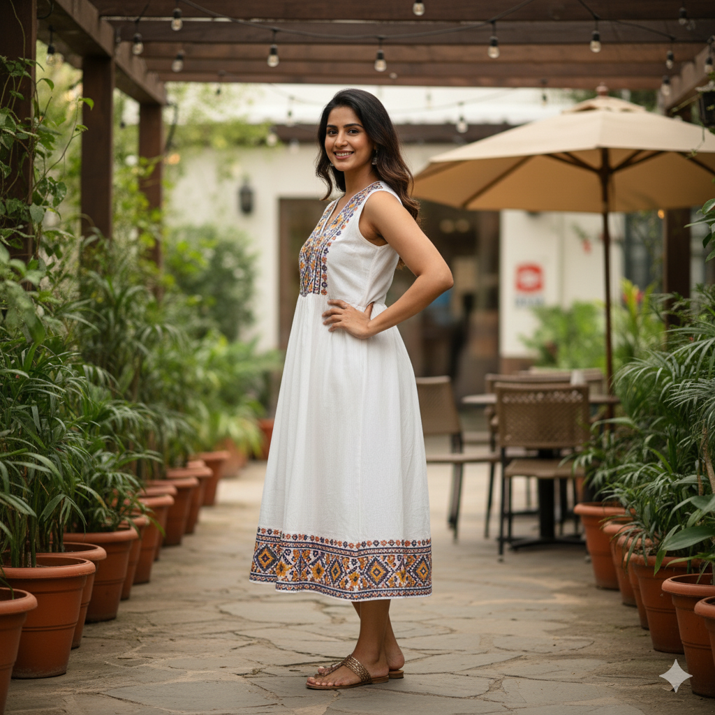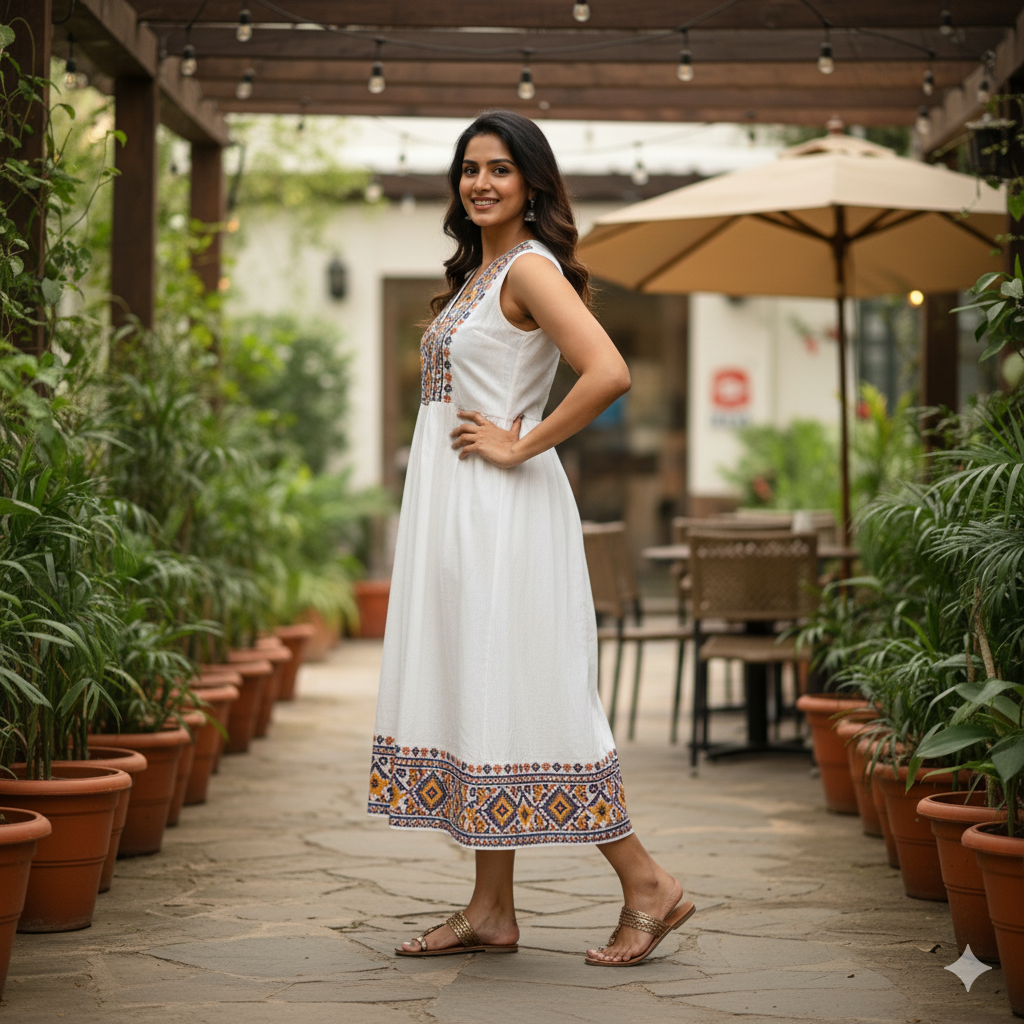 This embroidered trim dress features embroidered neckline and hem detailing. Crafted from breathable cotton, it’s designed for comfort and style. Perfect for casual brunches, shopping, and weekend outings. Made in India.
