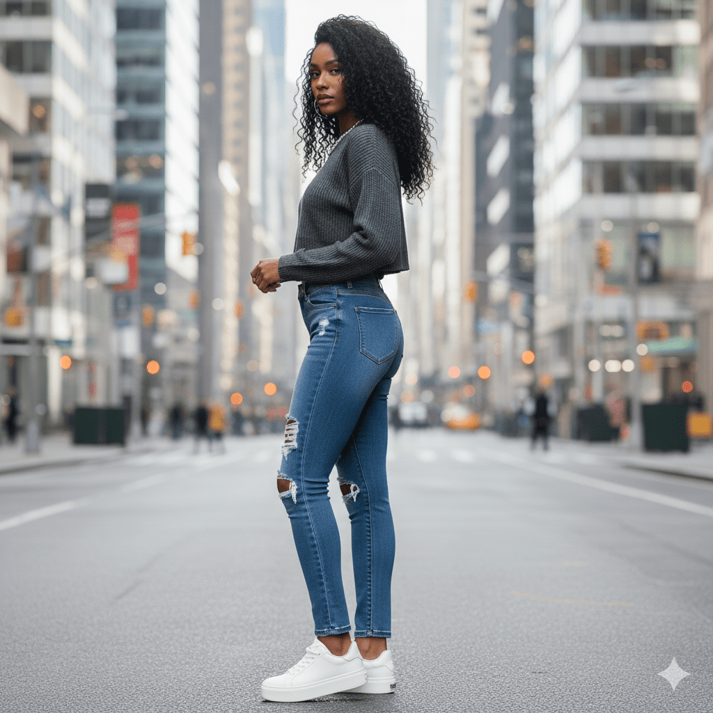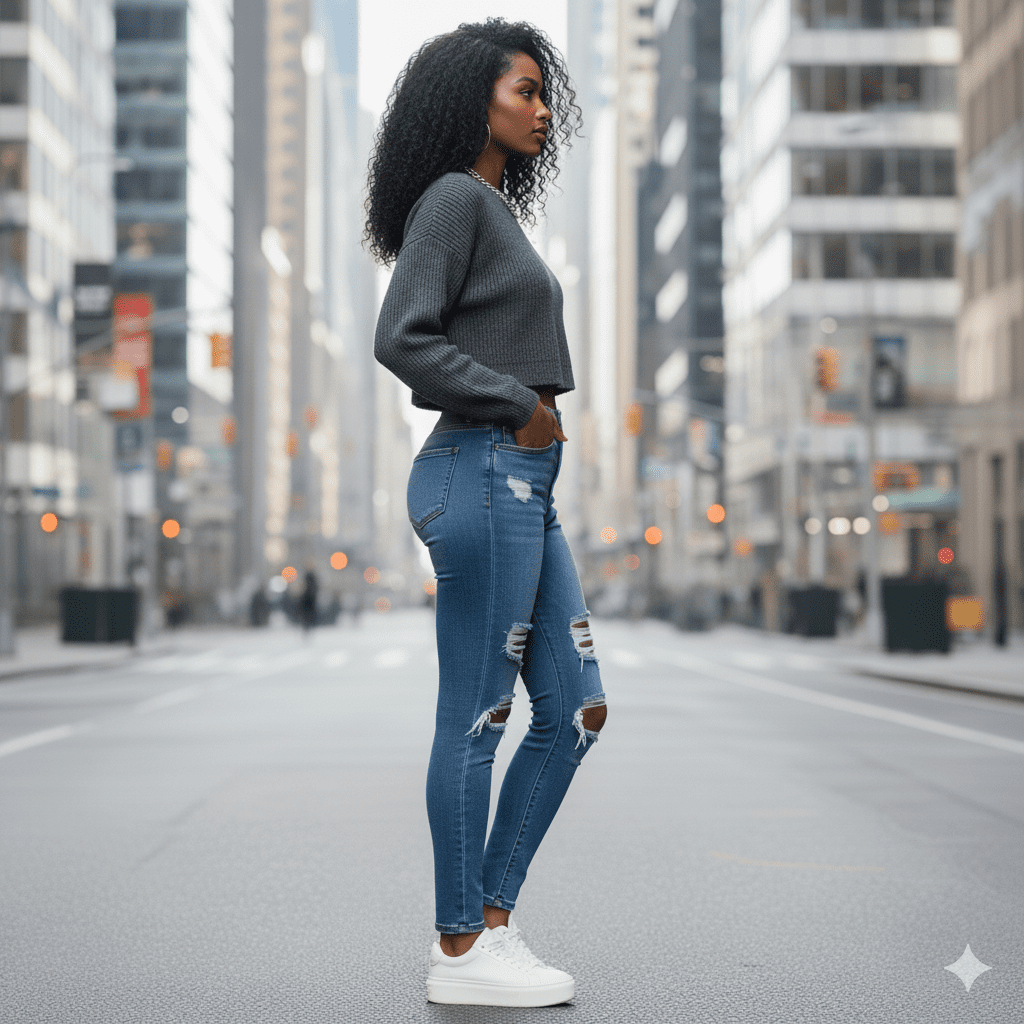 This high-rise ripped skinny jeans features strategic rips with lace insert detailing. Made from premium stretch denim blend, it offers comfort and distinctive style for all-day wear. Perfect for casual outings and office days. Made in India.
