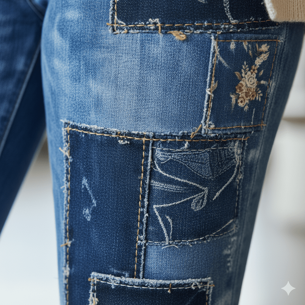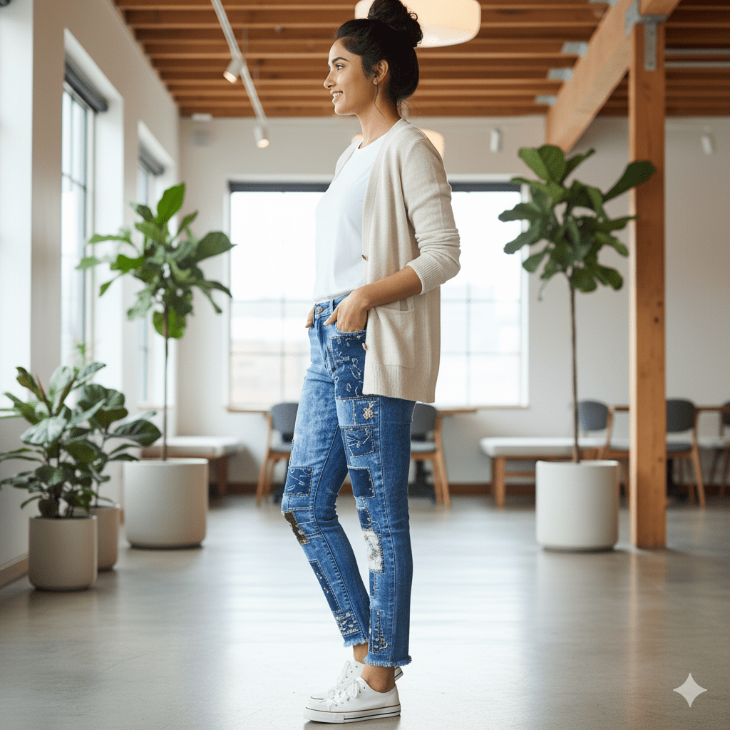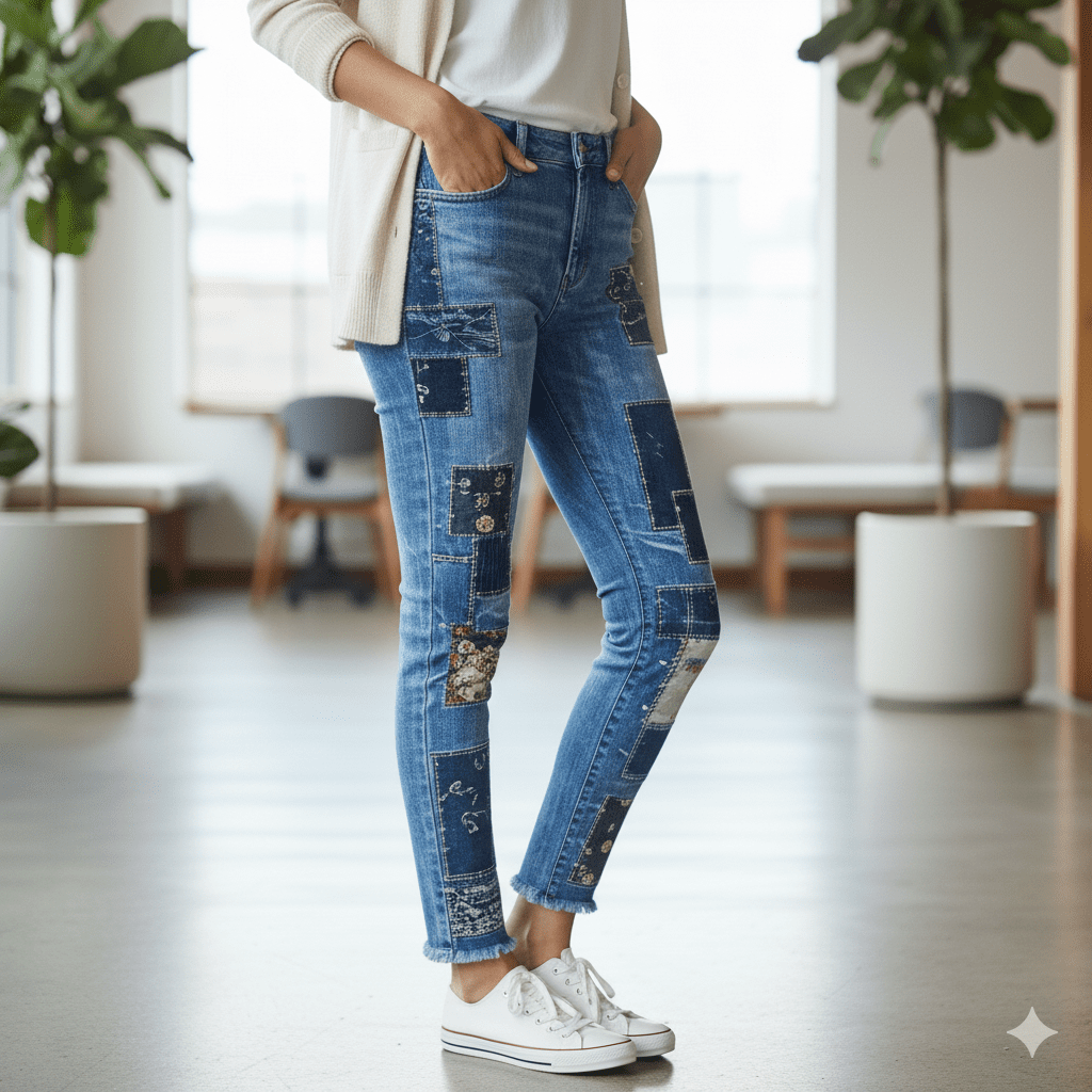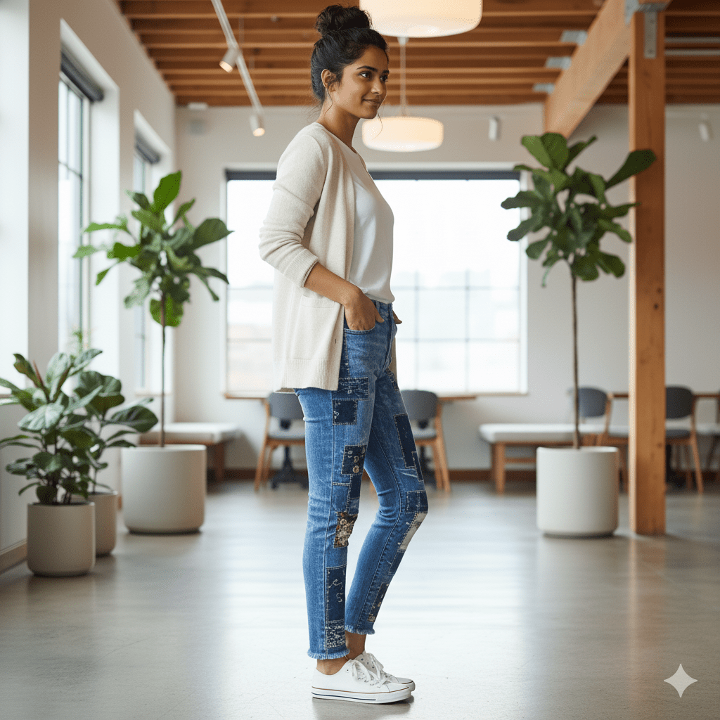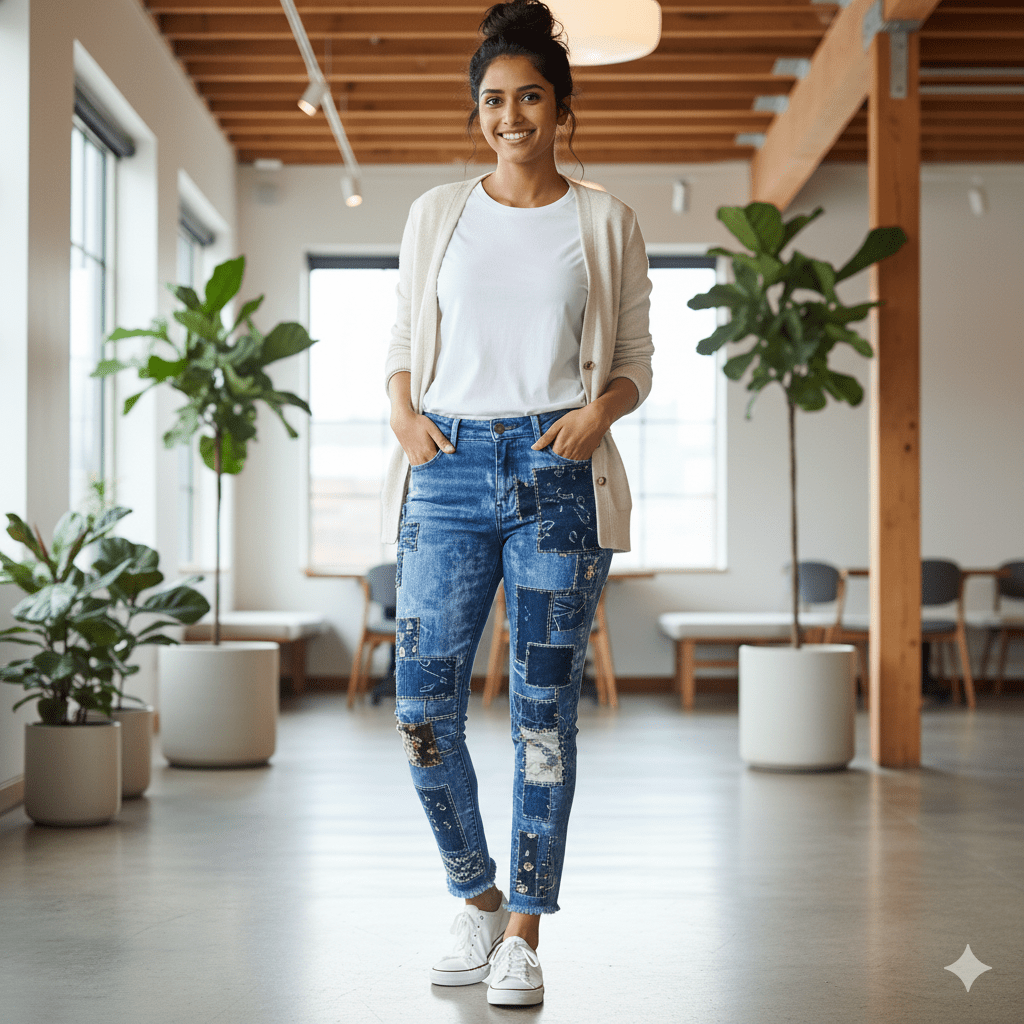 This patch detail jeans features decorative patchwork details with contrast. Made from premium stretch denim blend, it offers comfort and distinctive style for all-day wear. Perfect for casual outings and office days. Made in India.