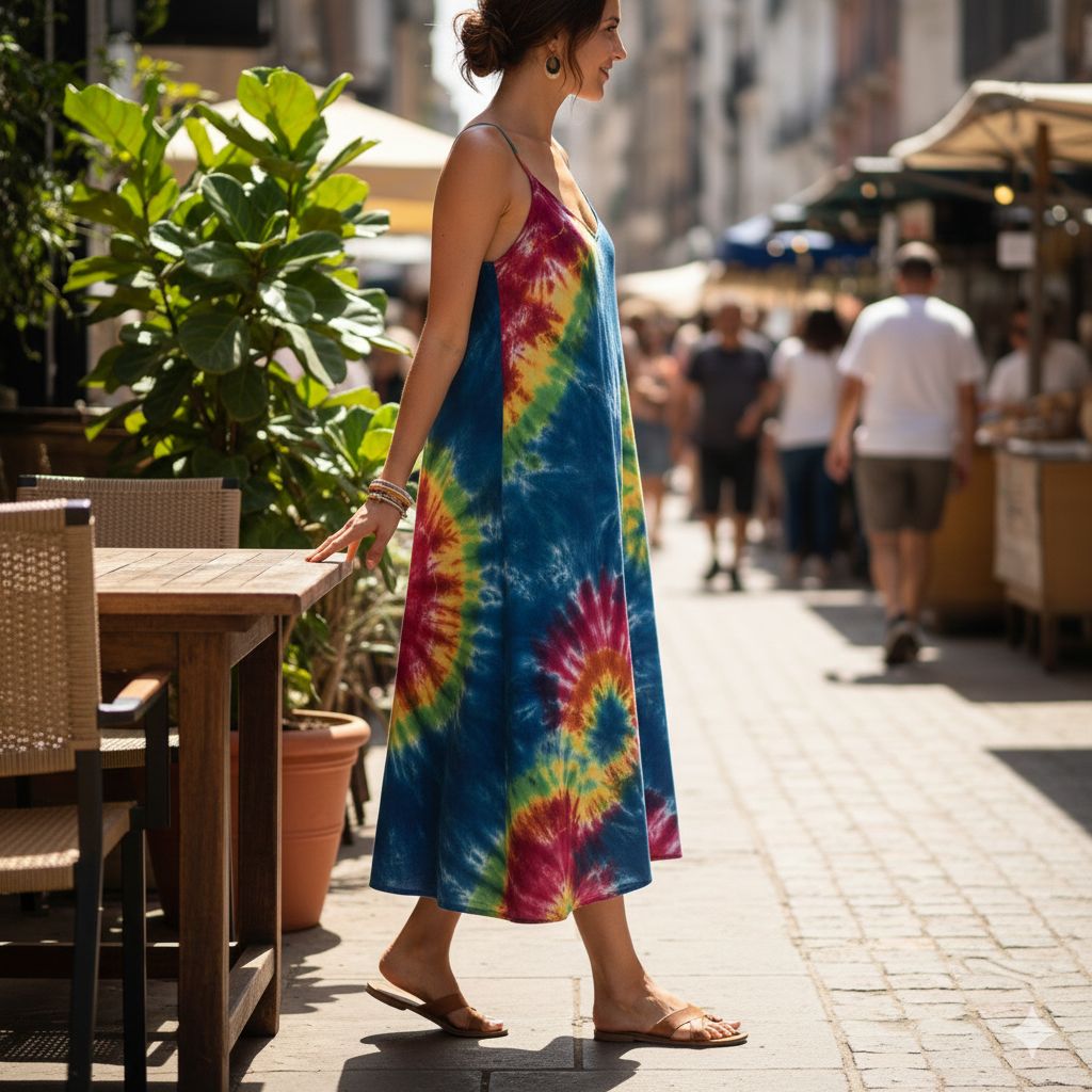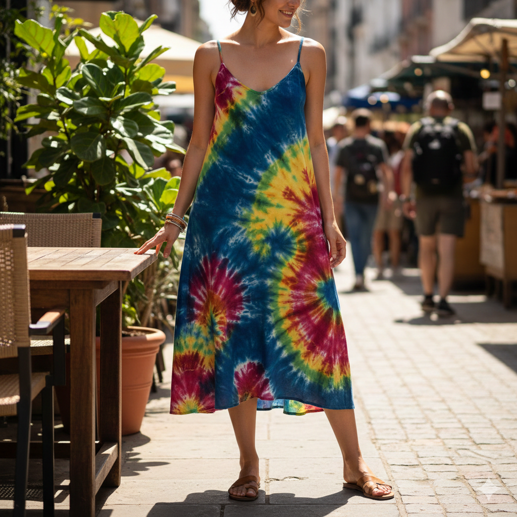 This tie-dye slip dress features vibrant tie-dye with slip-on silhouette. Crafted from breathable cotton, it’s designed for comfort and style. Perfect for casual brunches, shopping, and weekend outings. Made in India.